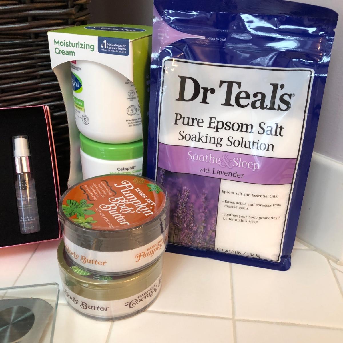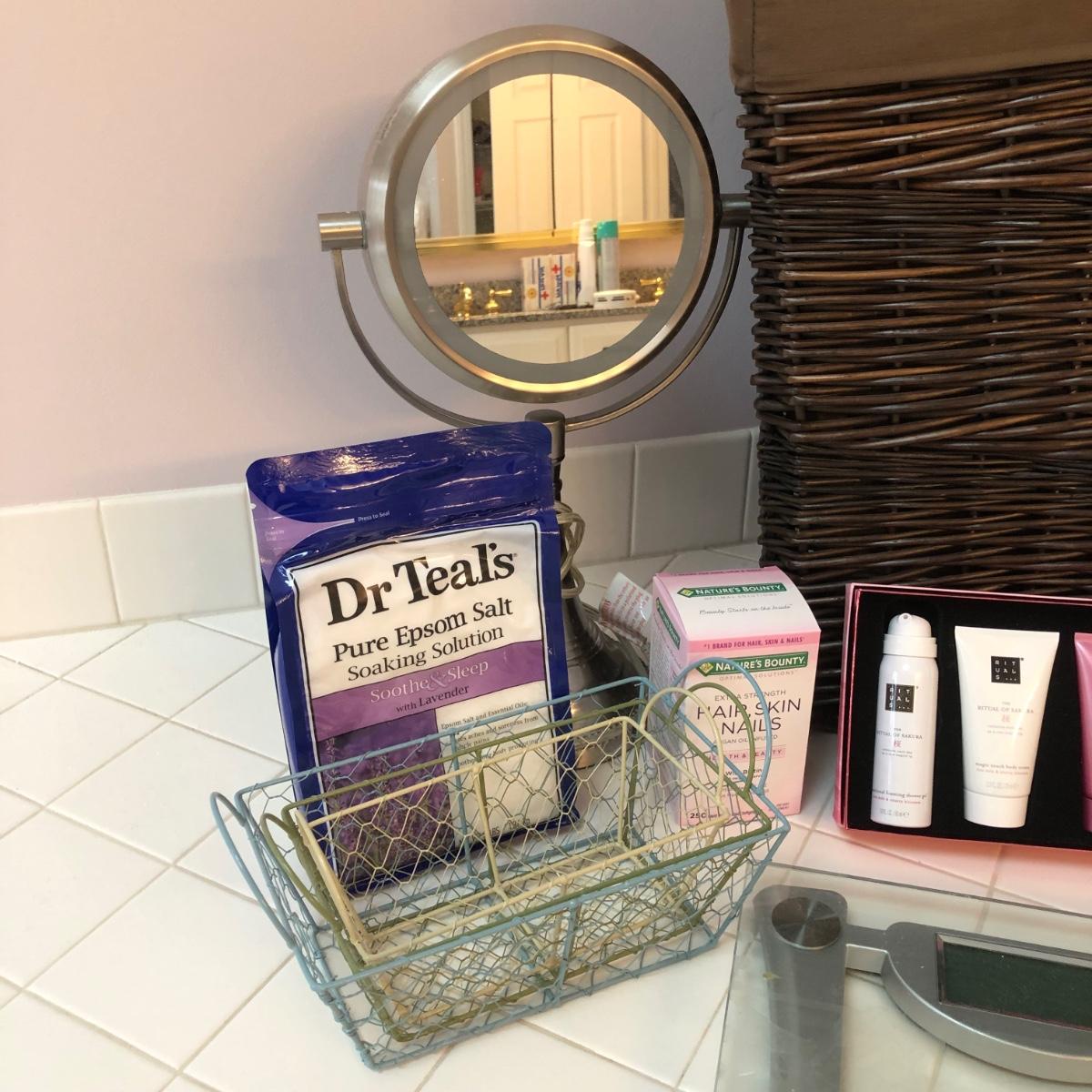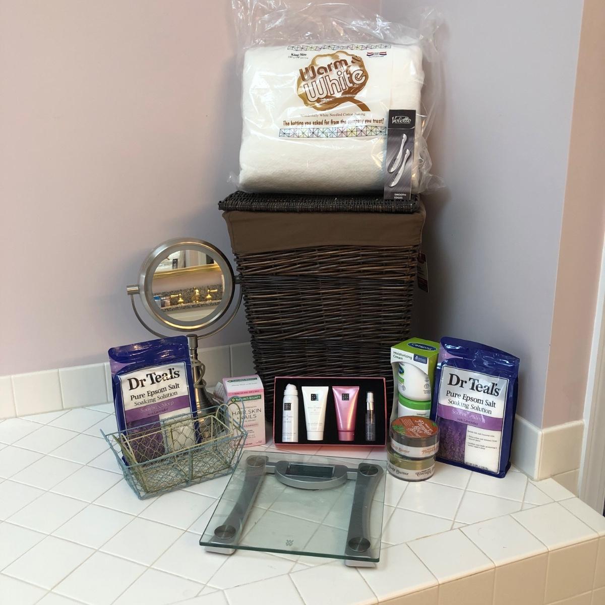 Includes unopened bath products, a small mirror, a wicker laundry basket, a scale, decorative baskets & more.