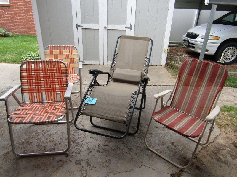 ZERO GRAVITY LOUNGE CHAIR AND 3 FOLDING LAWN CHAIRS