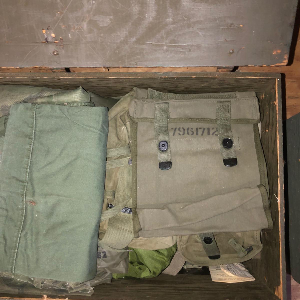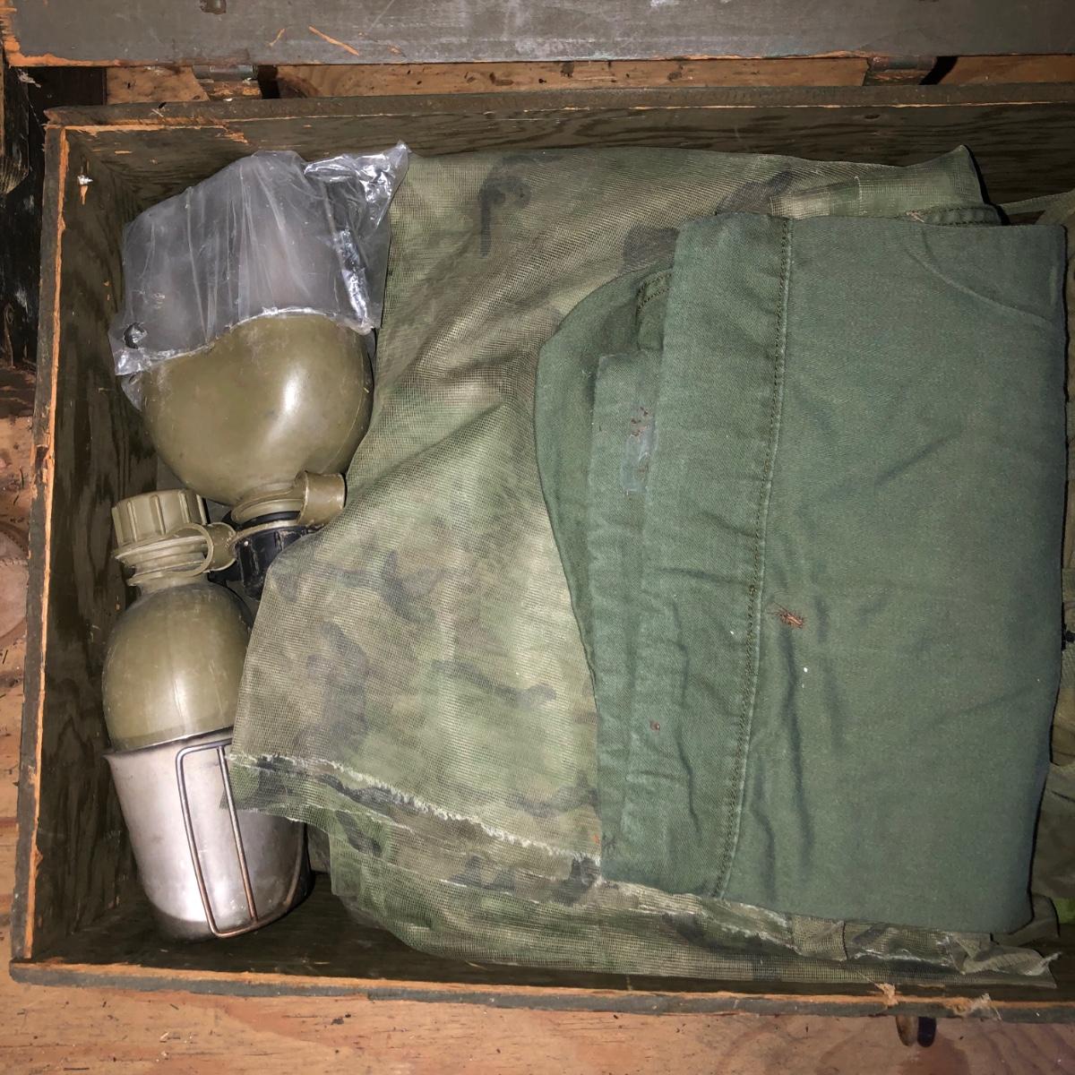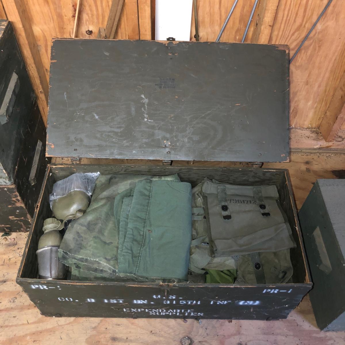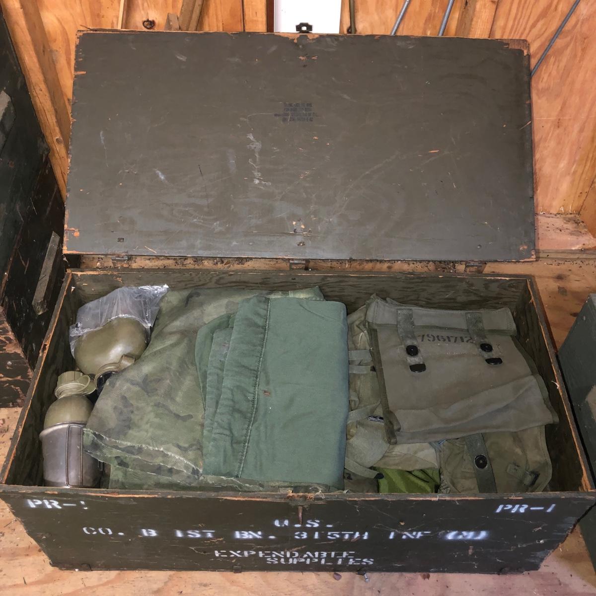 One footlocker of unsorted military items. Footlocker measures 32 x 12 x 16 inches.
