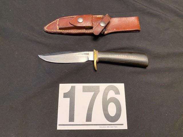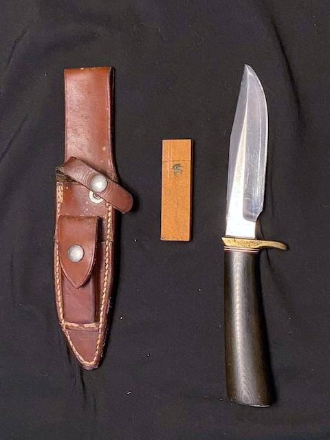 Includes original sheath with sharpening stone. Estimated weight of lot: 1 lbs. Measurement: 8"L x 8"W x 2"D