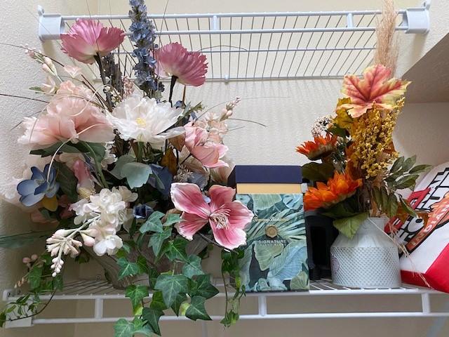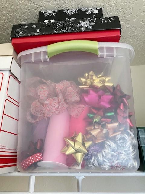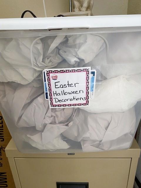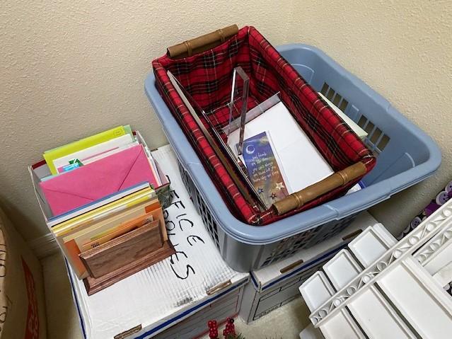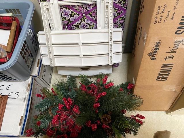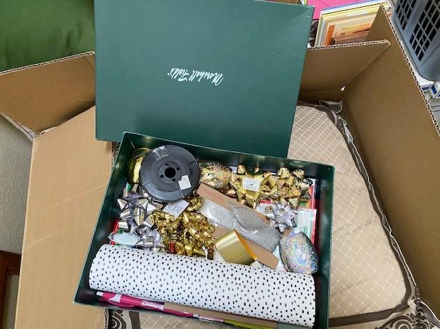 Includes: gift boxes, bows, office supplies, 2-drawer filing cabinet, assorted dried flowers, some bedding, Easter décor, Halloween decor & more.