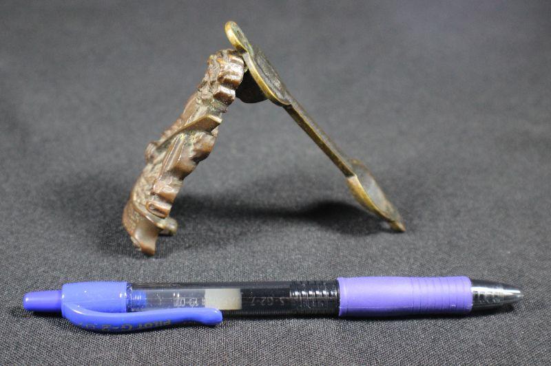 Bronze doorknocker of lady playing a fiddle. Measurements: 3 3/4"L x 1 1/2"W.