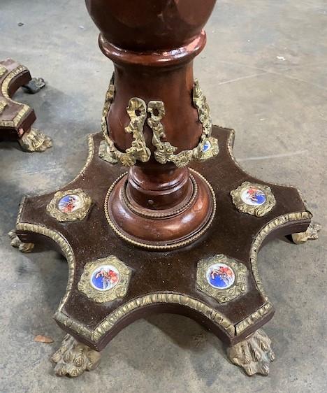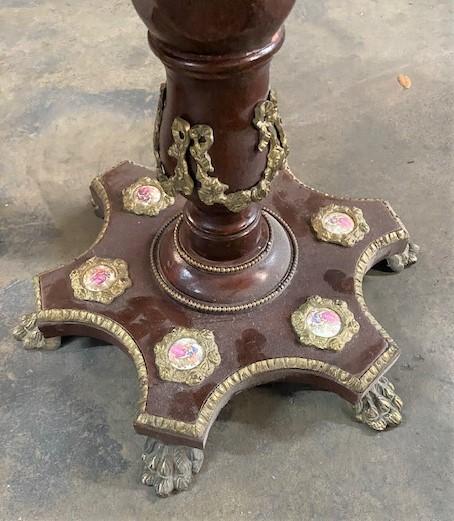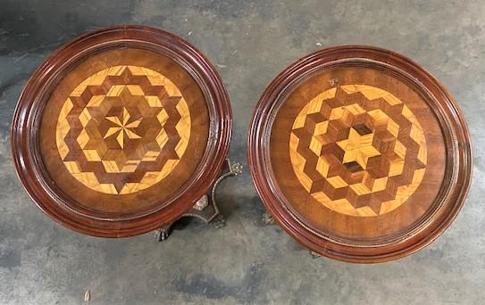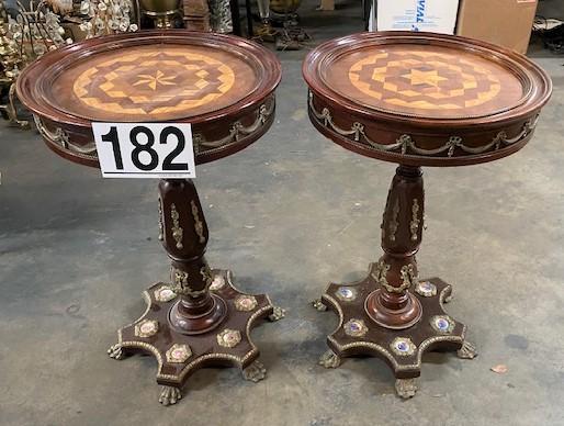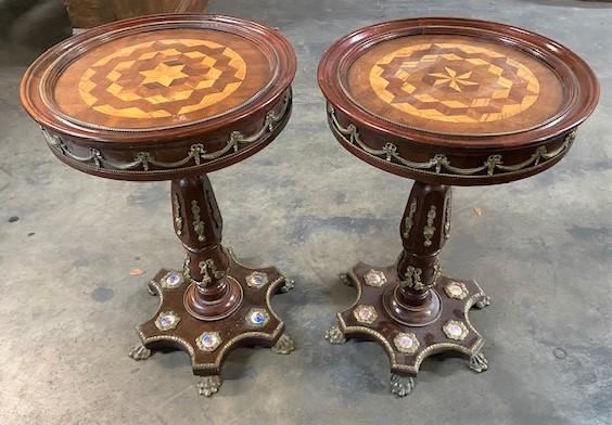 2 tables. Inlay tabletop with porcelain rosettes on base. Measurement: 18 1/2" (diameter, top) x 28"H (each)