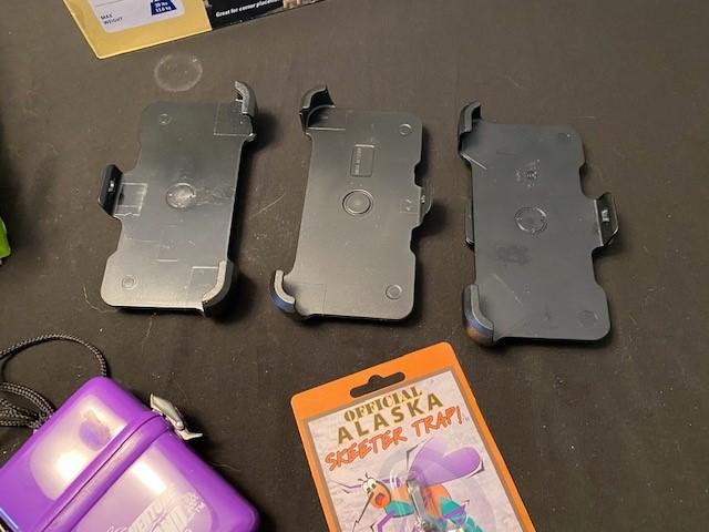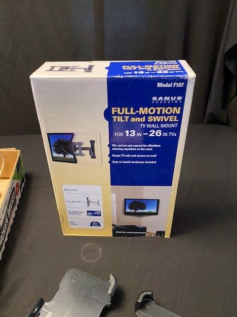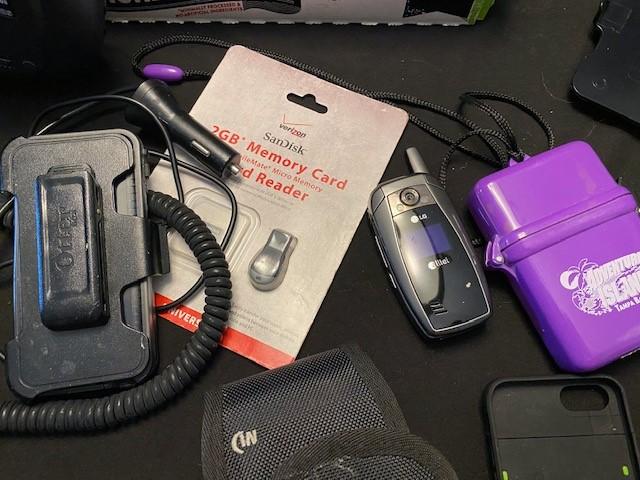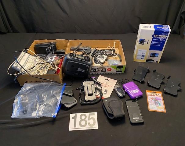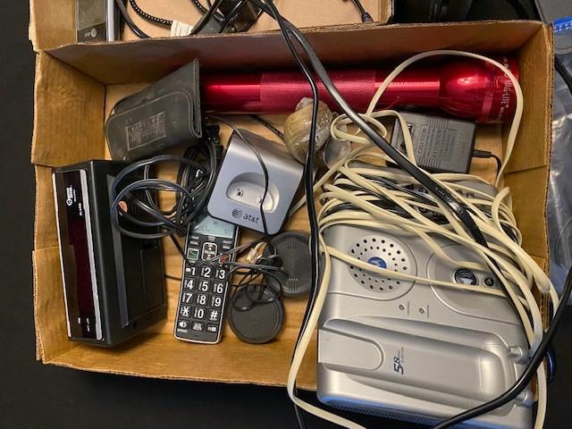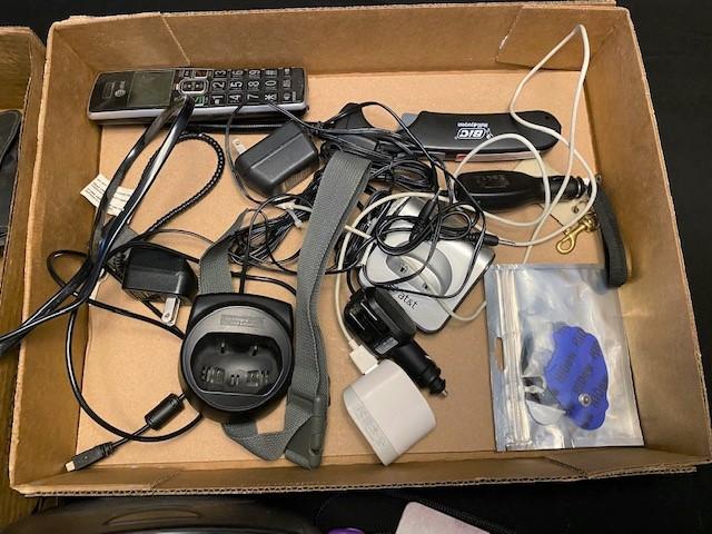 Includes cell phone cases, charging cables, Mag Lite, AT&T phone system, TV wall mount, and more. Measurement: 16"L x 11"W (two boxes, each)