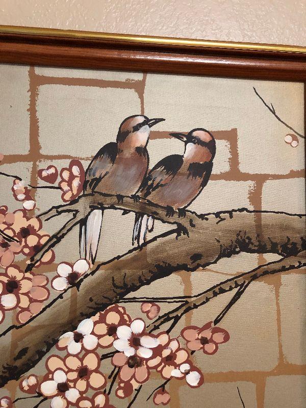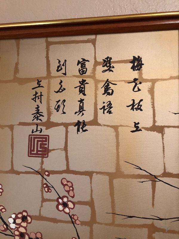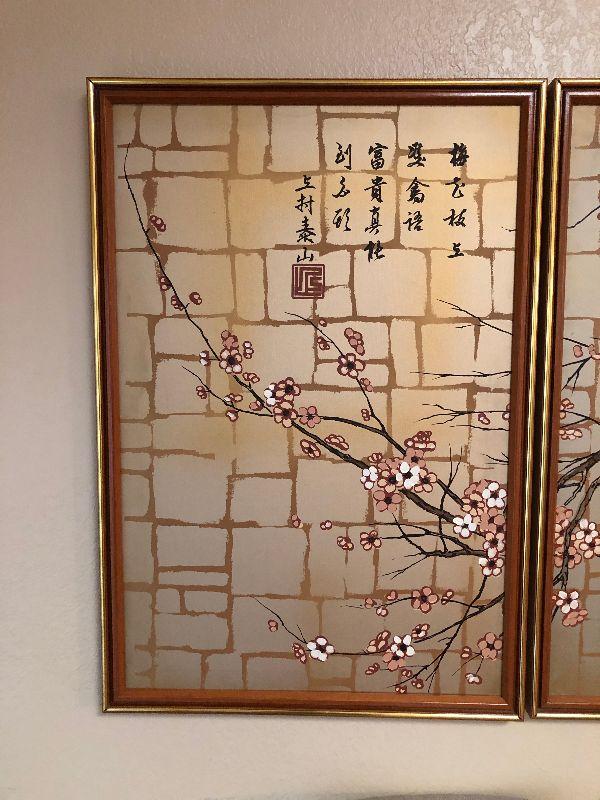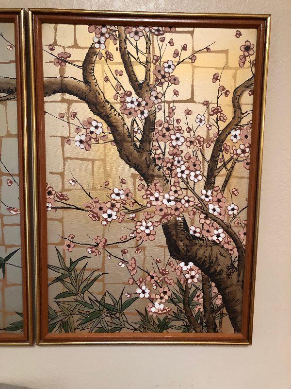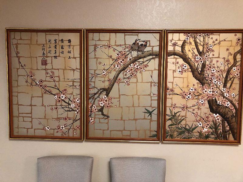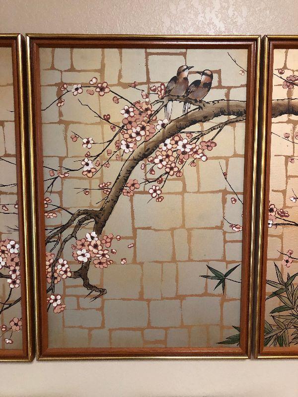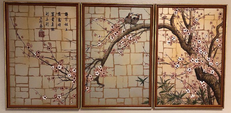 Lot#186 Asian Cherry Blossom & Birds Tryptic 3Panel Painting