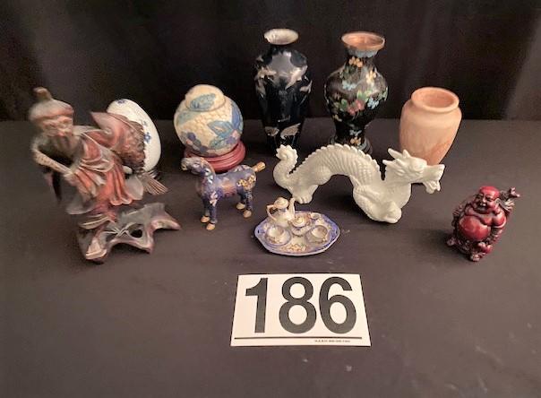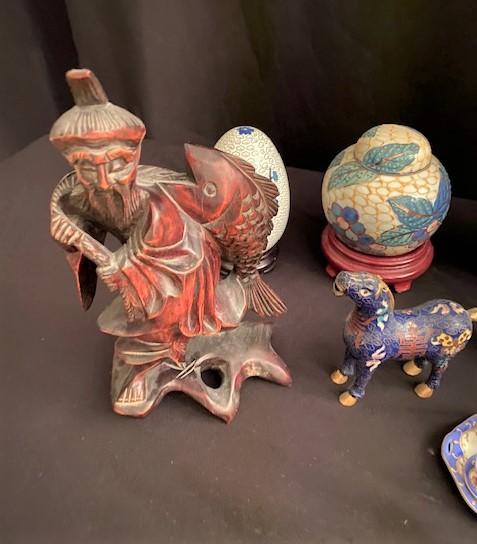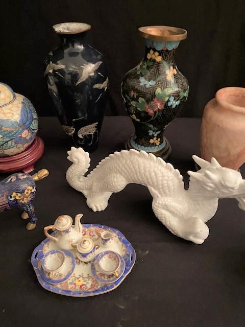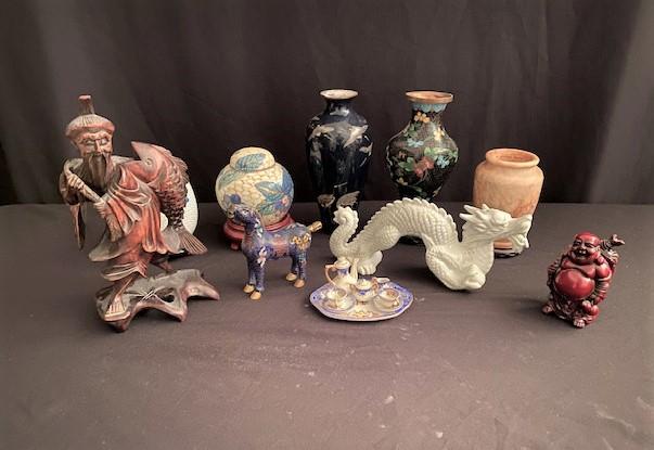 Includes: cloisonne, mahogany, ceramic. Estimated weight of lot: 10lbs. Measurement: 9"H x 9"W (largest)