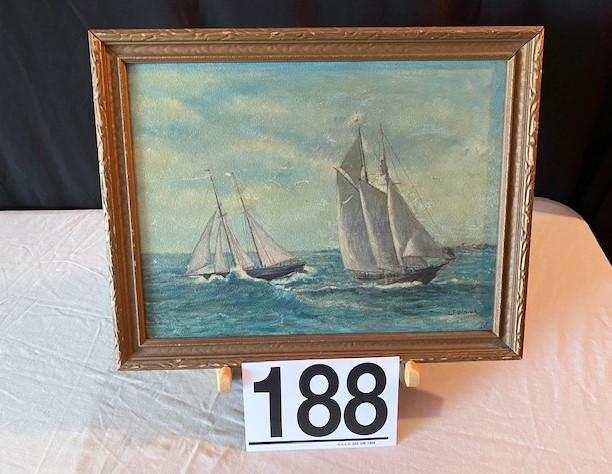 Gertrude Thebaud and Bluenose. Appears to be in original frame. Dust cover has tear. Measurement: 15"W x 12"H