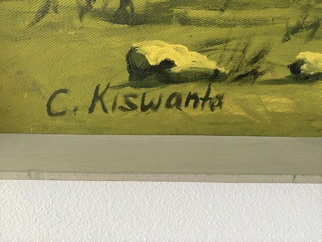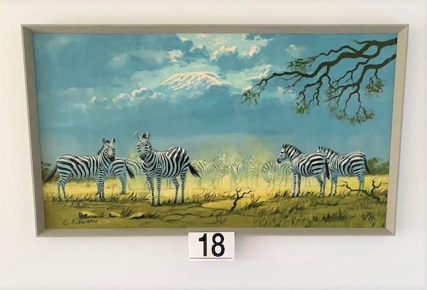 Acrylic painting on board of zebras on dusty plain w/ thunderheads & Kilimanjaro in background. Signed C. Kiswanta. Estimated weight of lot: 10lbs. Measurement: 43" x 24"