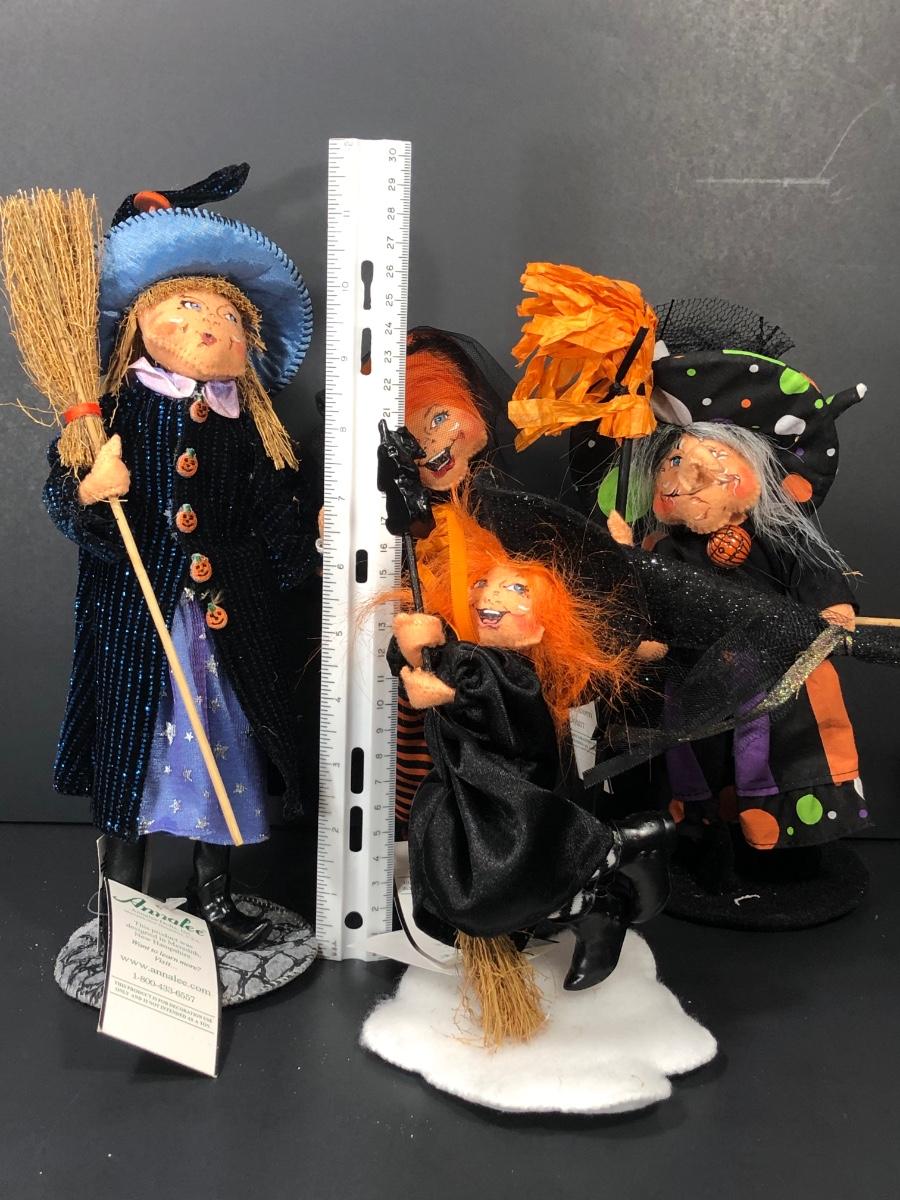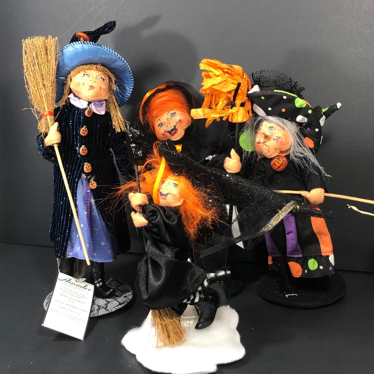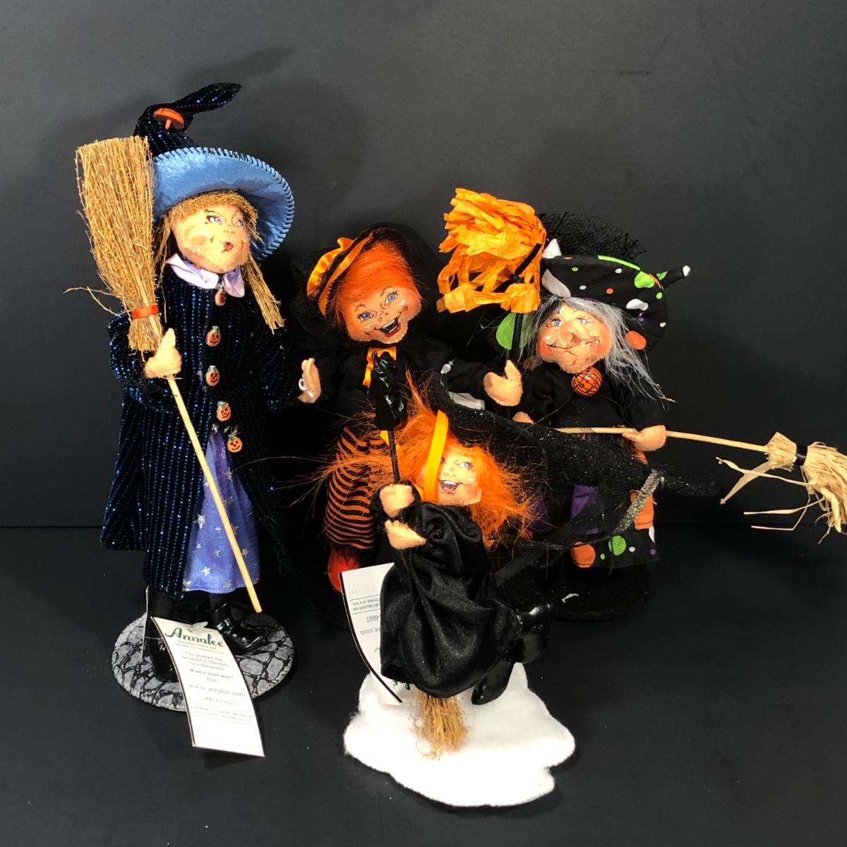 Includes four Halloween themed Annalee dolls. 10" Belinda Witch, 10" Good Witch, 9" Halloween Hagatha, & 10" Flying Witch. All dolls have their Annalee tag.