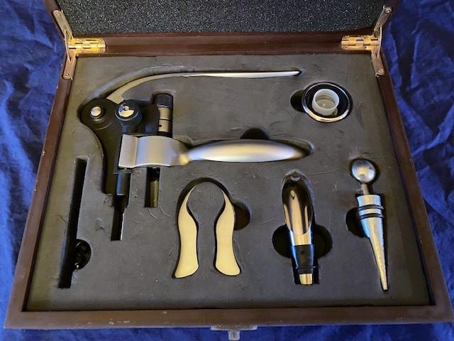 Includes wine bottle opener, stoppers, foil cutter, and more, in case. Measurement: 11"W x 9"H