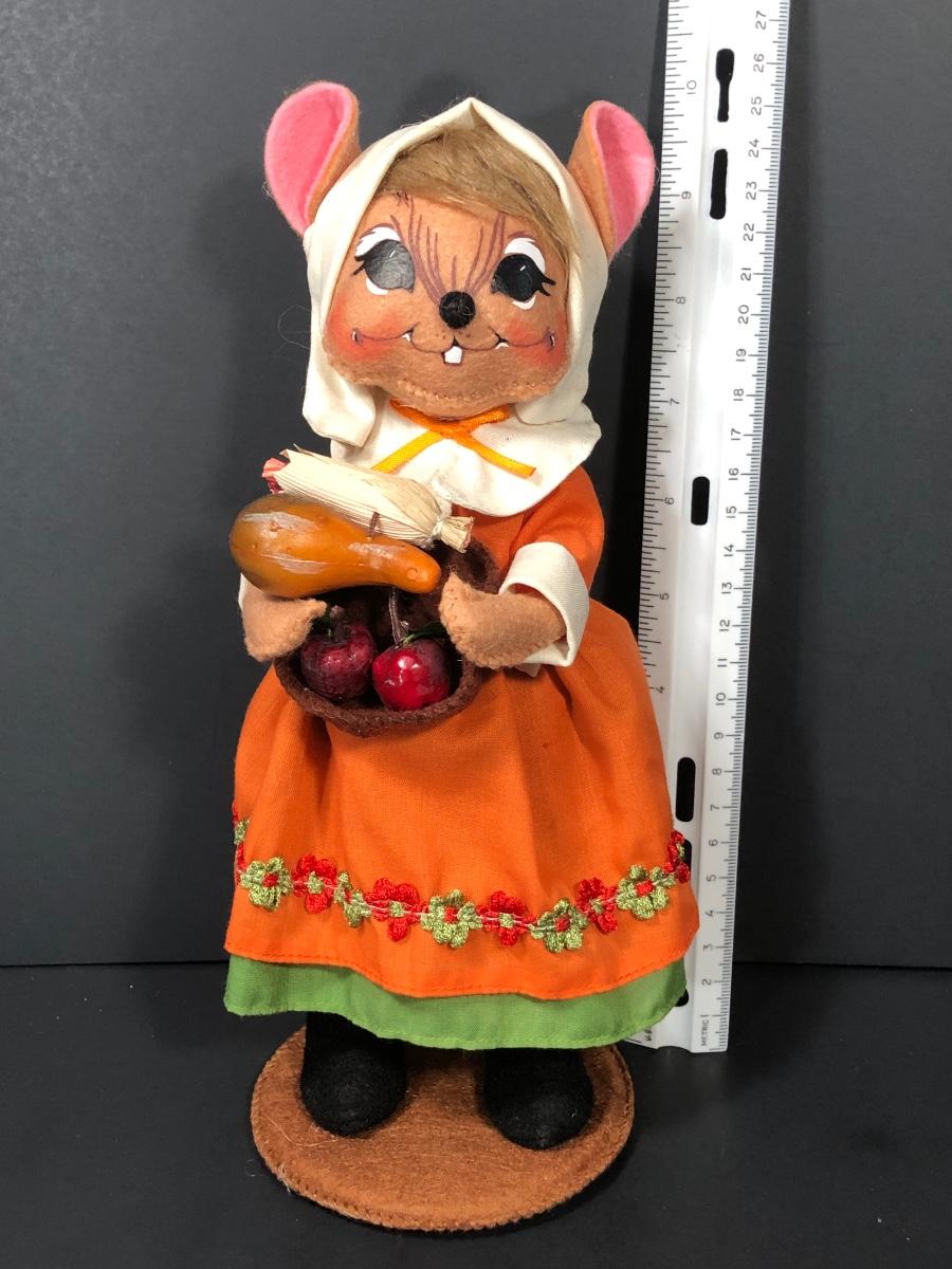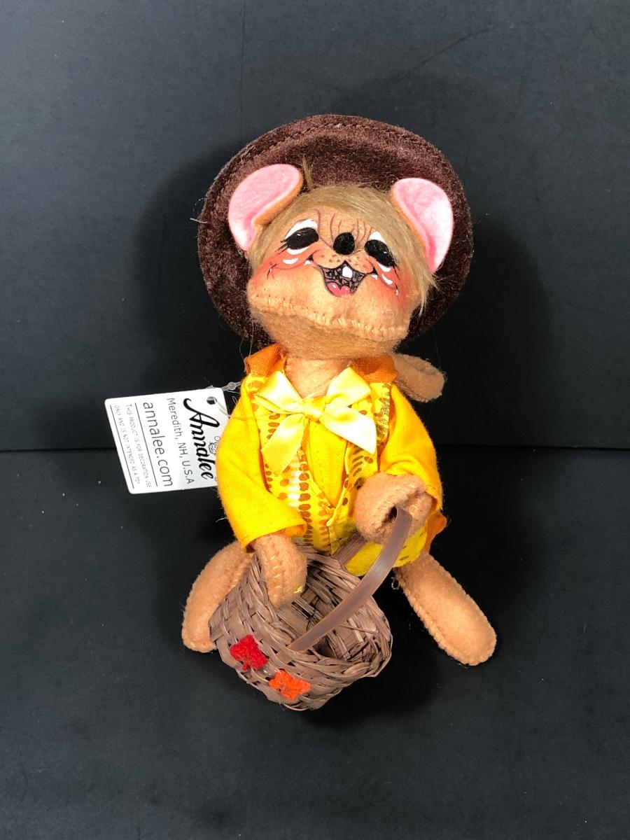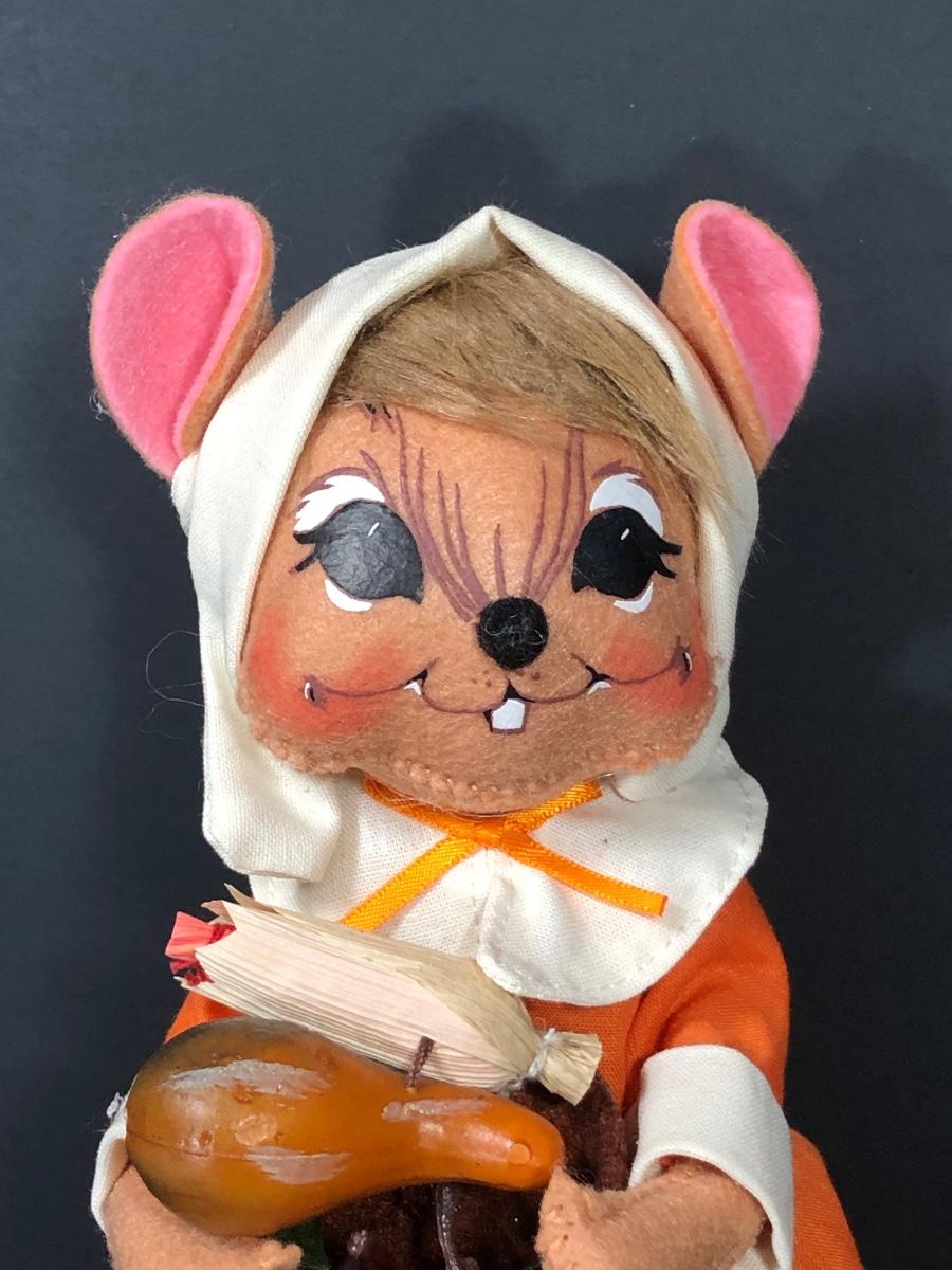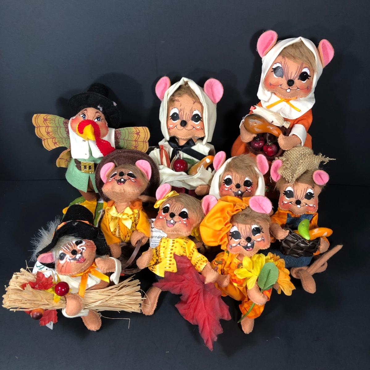 A collection of autumnal Annalee dolls including 7" Pilgrim Boy Turkey, 8" Pilgrim Girl Mouse, 6" Pilgrim Boy Mouse, 6" Pilgrim Girl Mouse, 6" Pilgrim Boy Chipmunk, 6" Autumn Leaf Mouse and more without tags.