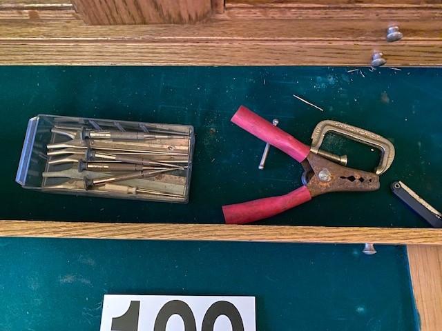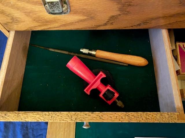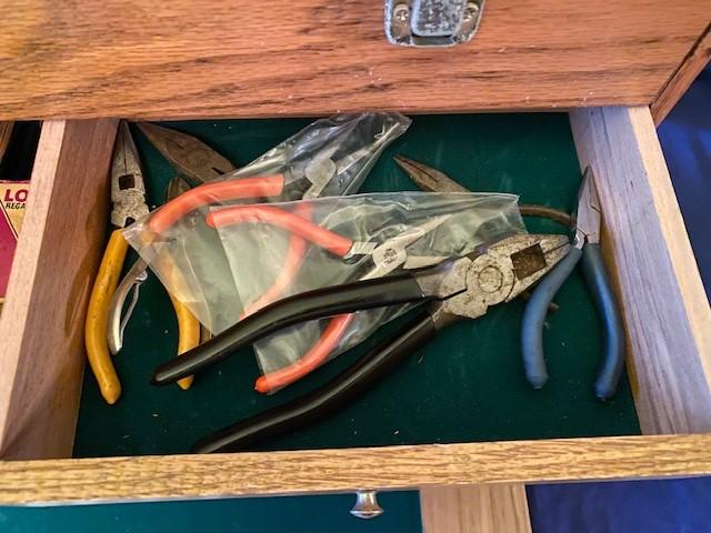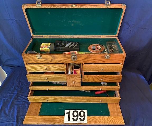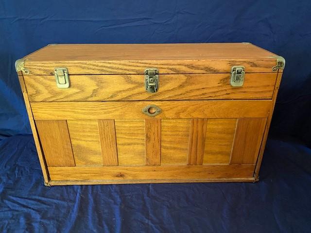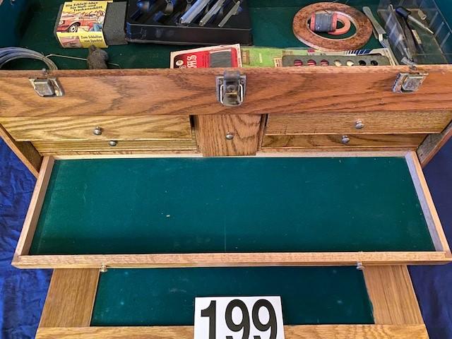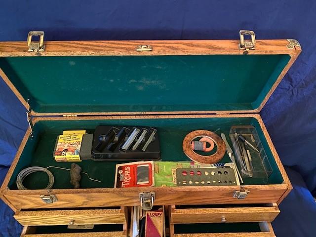 Oak wood construction. Felt lined. 8 drawers. Includes miscellaneous model building tools as pictured. Measurement: 26"W x 15 1/2"H x 9 1/2"D