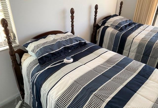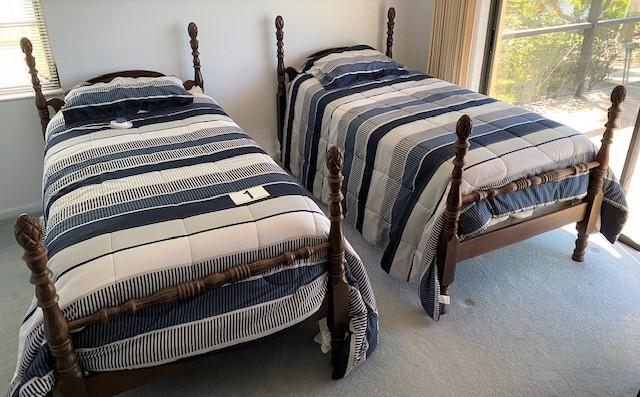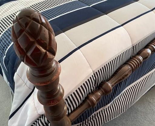 Some wear visible. Carved finials. Head/foot board, rails, mattress, box spring, No bedding, linens or blankets included.
