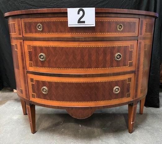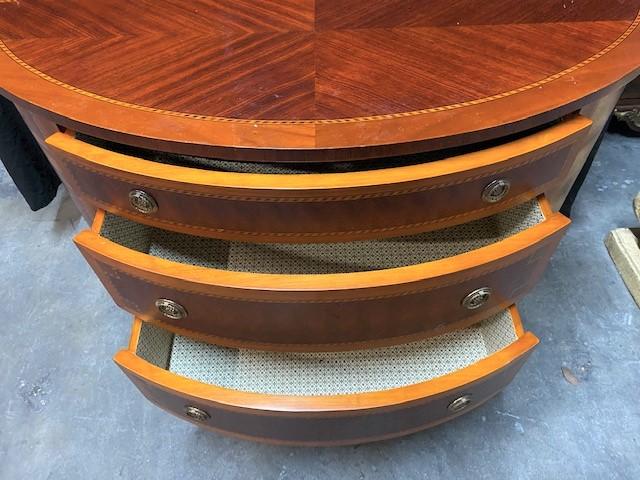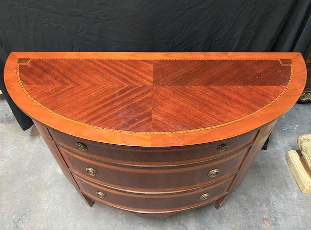 Semi-circle design. 3 drawers. Estimated total lot weight : 50lbs. Measurements: 34"H x 18"D x 46"W.