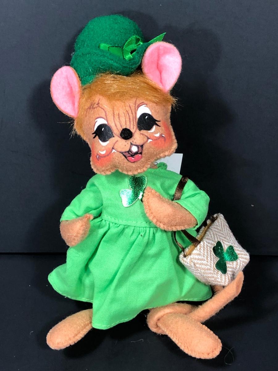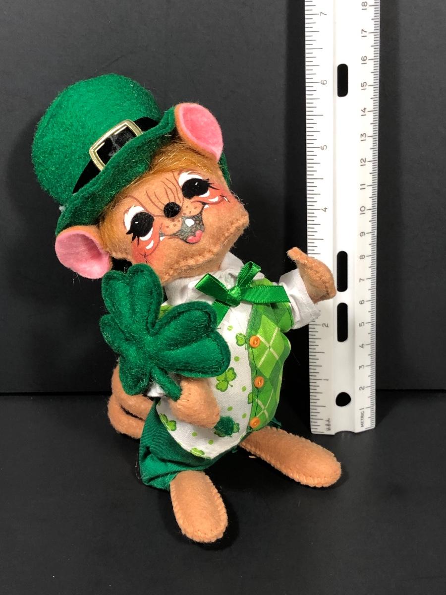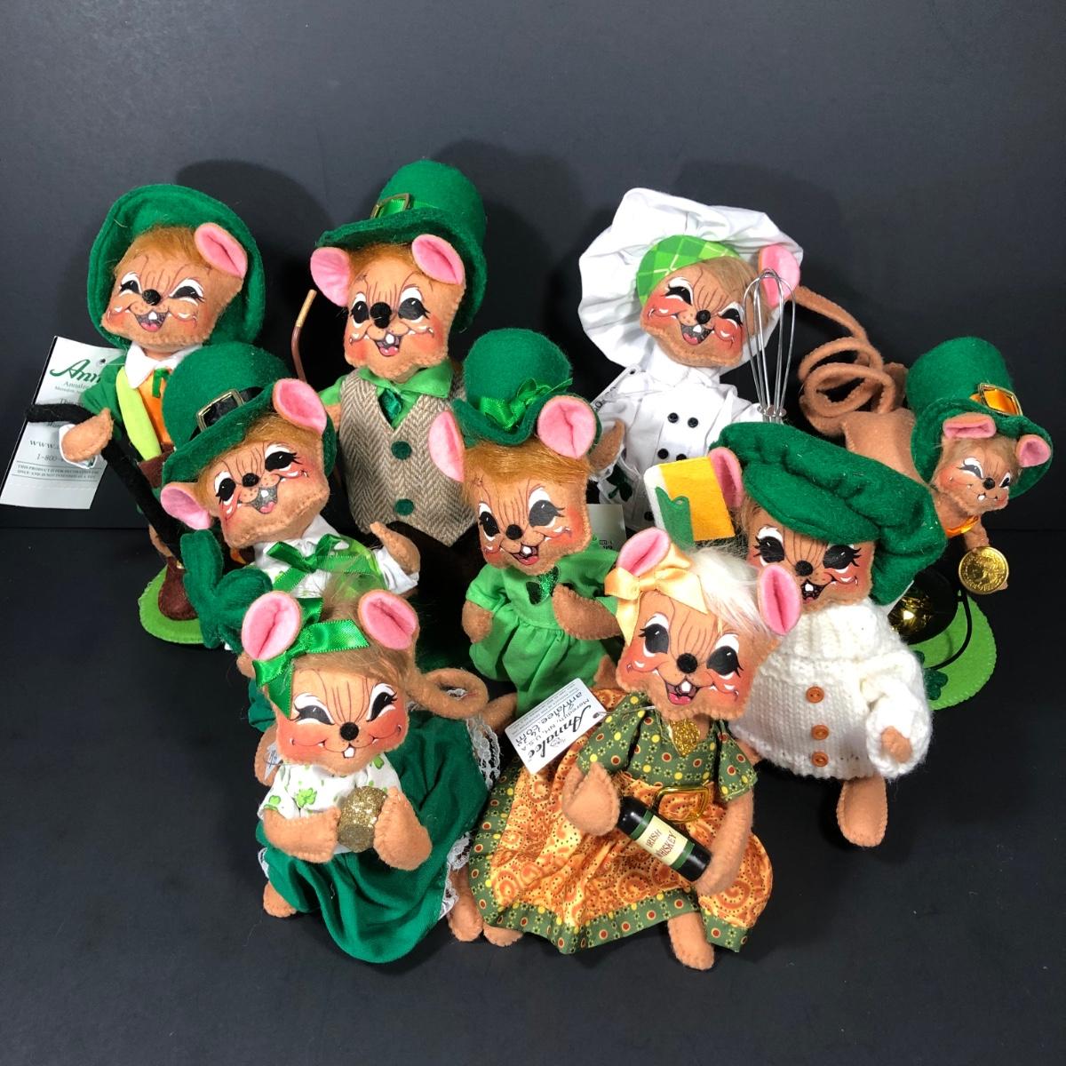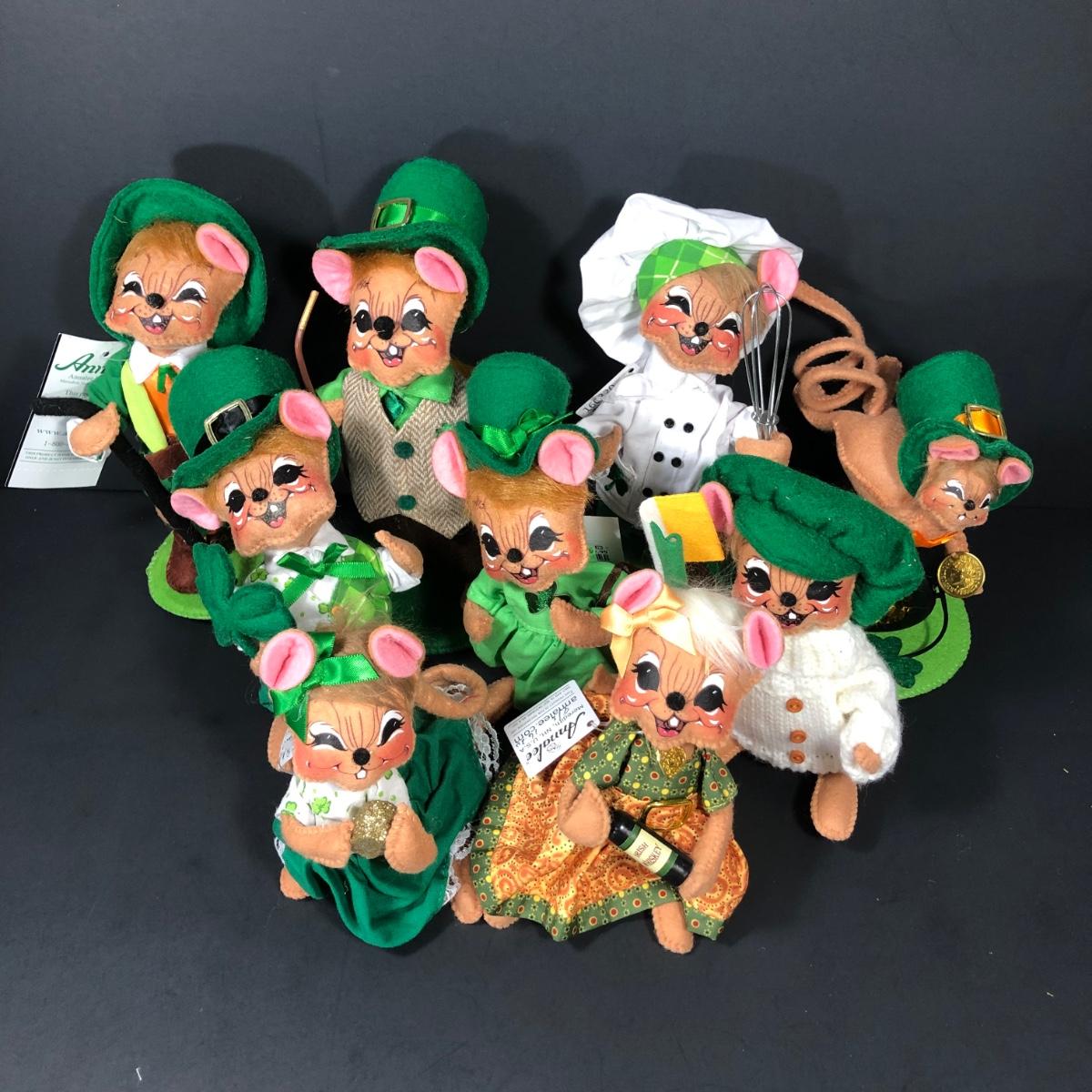 A collection of St. Patrick's day themed mice including 6" Leprechaun Boy Mouse, 6" Shamrock Chef Mouse, 5" Pot o' Gold Mouse, 6" St. Patrick's Girl Mouse, 6" Irish Whiskey Mouse, 6" Lass Mouse and more without tags.