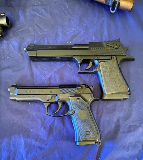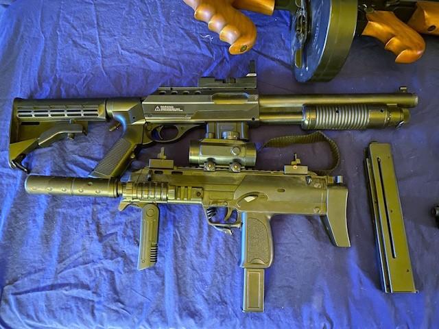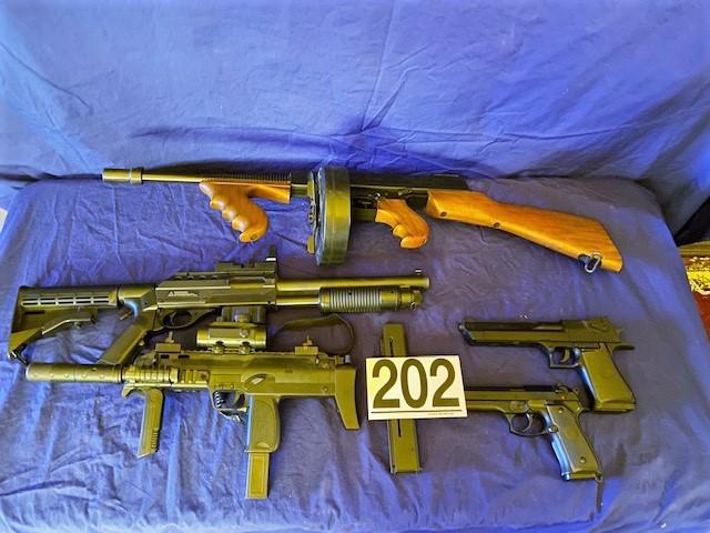 Total of 5 pieces. Includes Thompson submachine gun, shotgun, two pistols, and more. Measurement: 34"L (longest, Thompson)