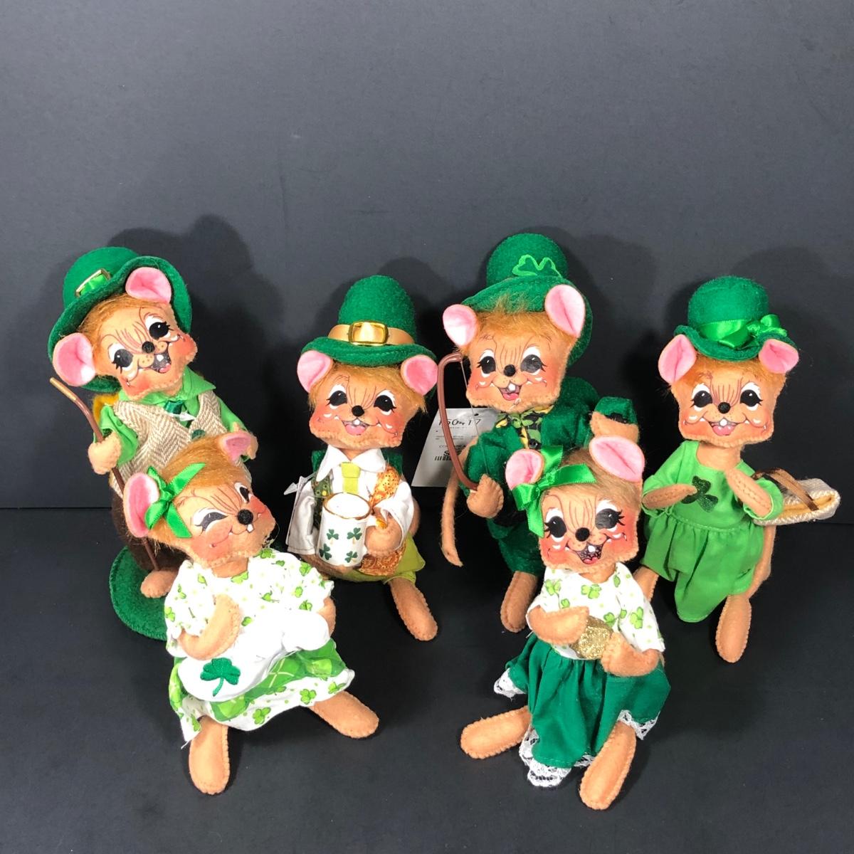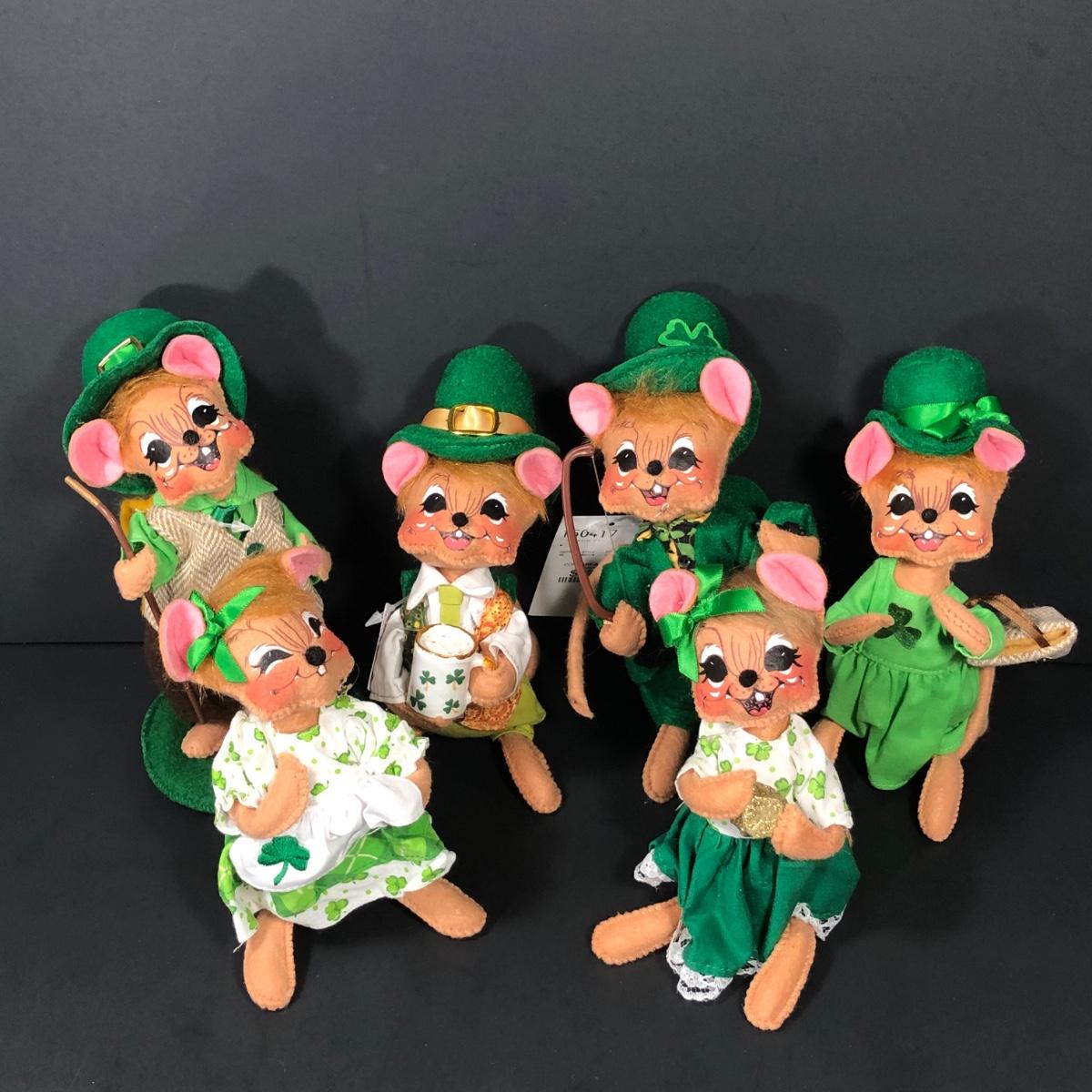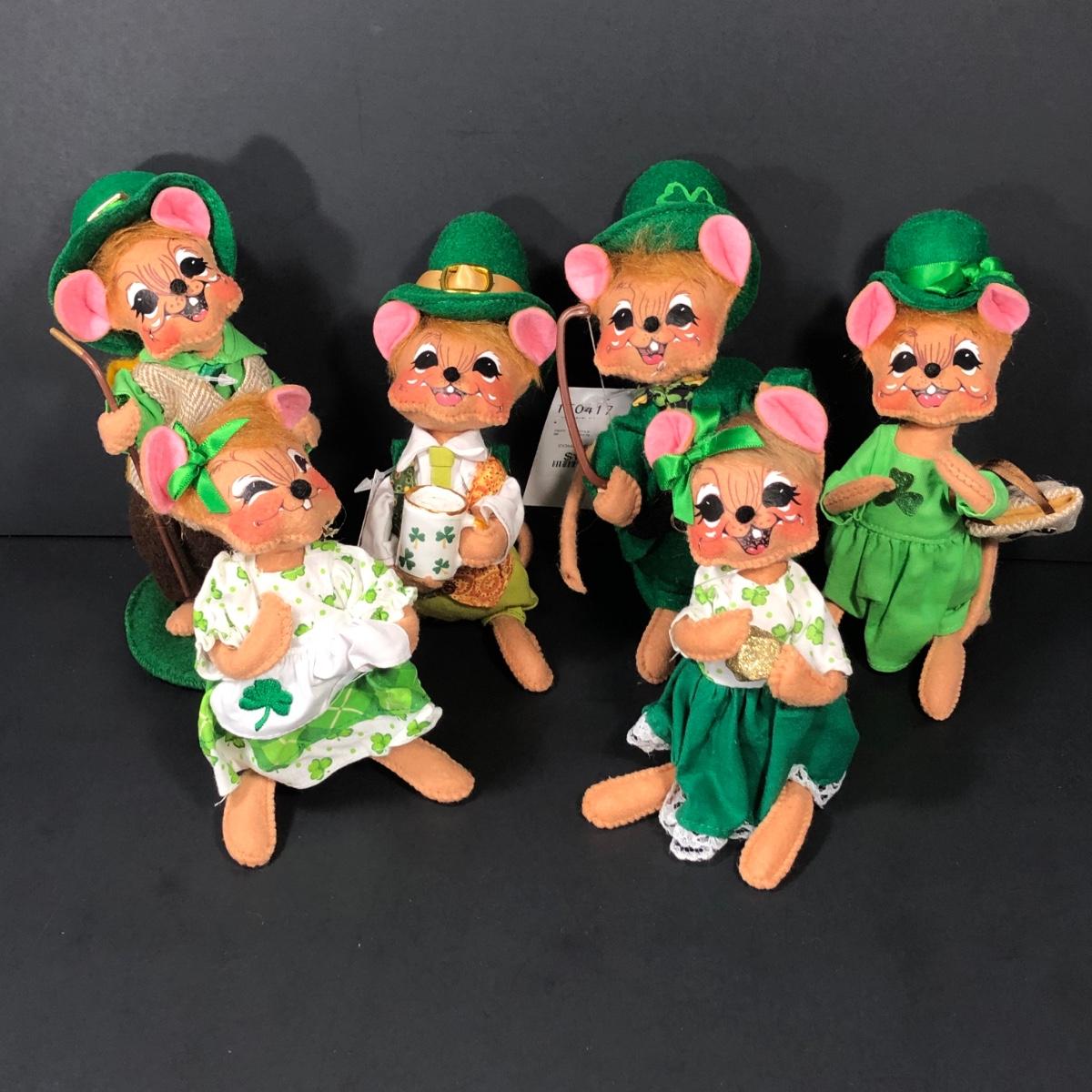 Six Annalee mice including 6" Irish Coffee Mouse, 6" St. Patrick's Girl Mouse * more without tags.