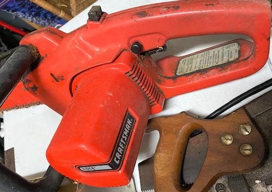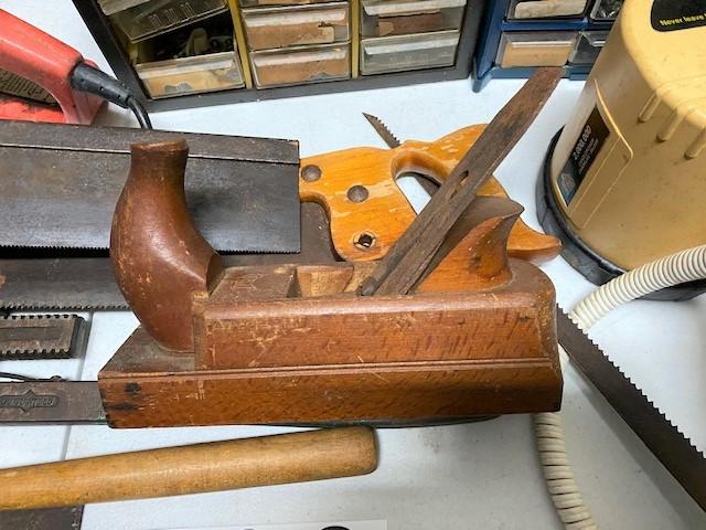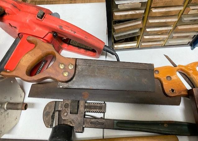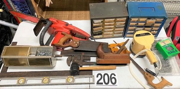 Including: assorted fastener chests, pipe wretch, level, plane, spotlight, chainsaw & more.