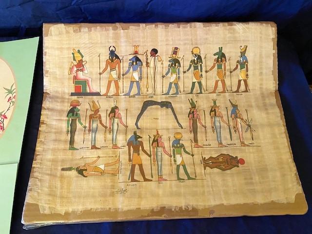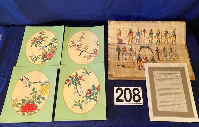 Includes papyrus, and Chinese bird lithos. Papyrus is unopened. Total of 5. Measurement: 18"L x 13"W (largest)