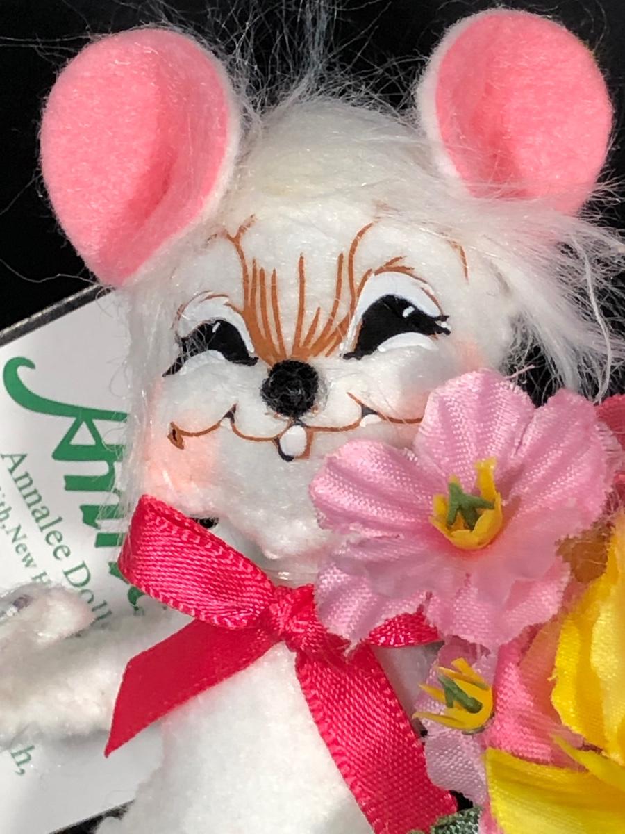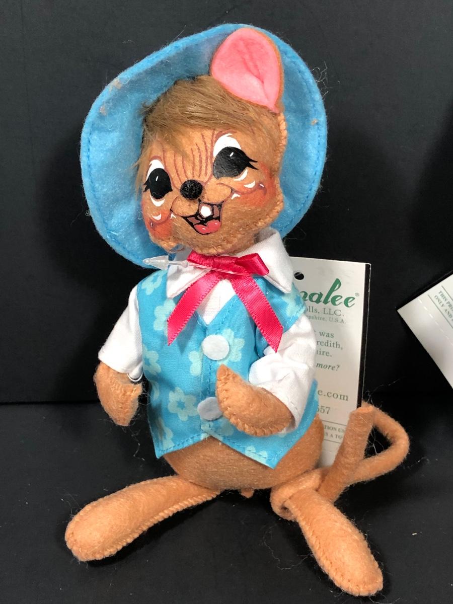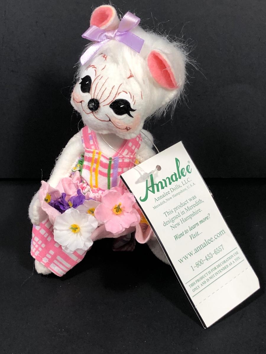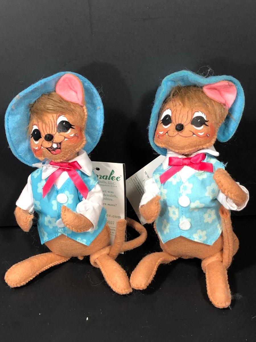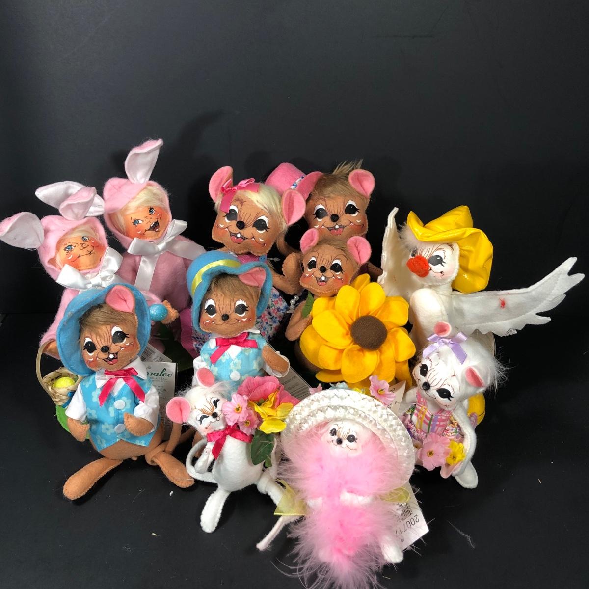 An assortment of Annalee dolls including two 6" Easter Bunny Kids, 8" Springtime Girl Mouse, 8" Springtime Boy Mouse, 6" Sunflower Mouse, 6" Spring Boy Mouse, 7" Ready For Rain Duck, 5" Spring Flowers Mouse, 5" Easter Bonnet Mouse, and 6" Spring Flowers Mouse.