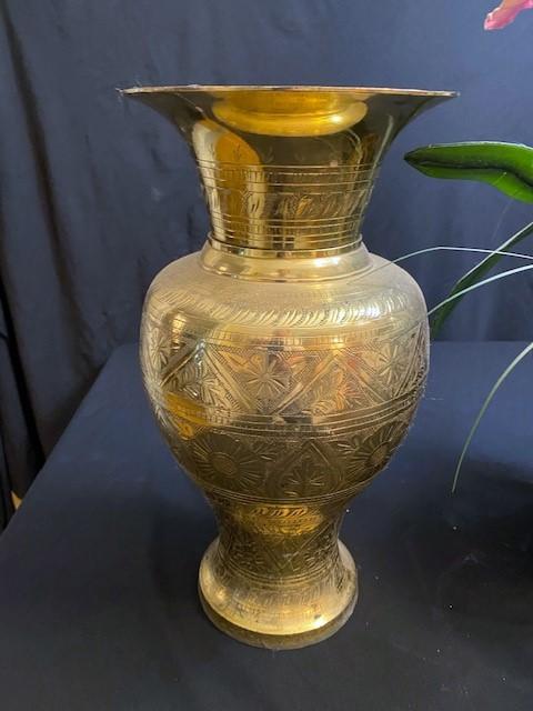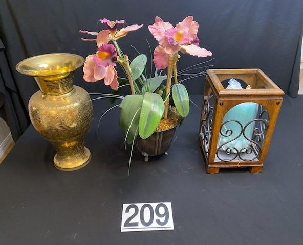 Includes brass vase, faux orchid, and candle décor. Measurement: 15"H x 8"W (largest)