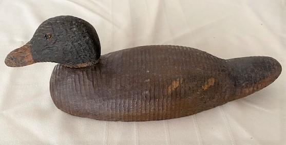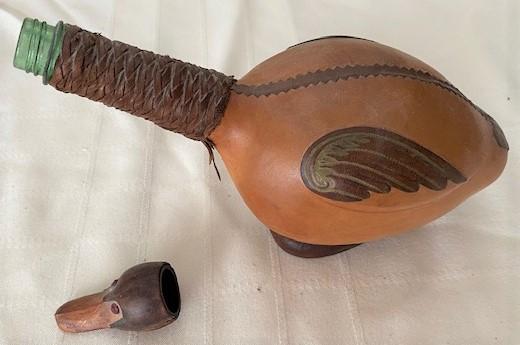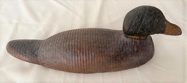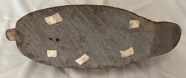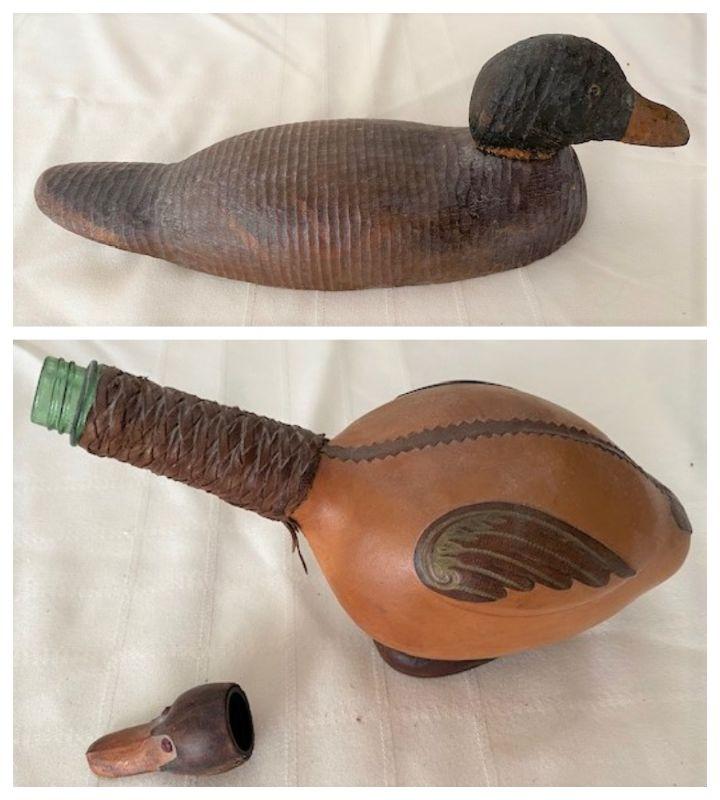 Decoy is ribbed, unsigned. Bottle is covered in leather. Measurement: 16"L x 5 1/2"H (decoy)