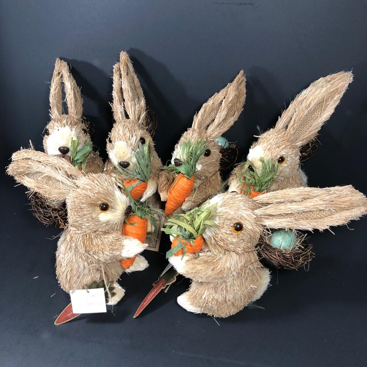 Includes 6 bunnies with carrots in their hands and nests on their backs.