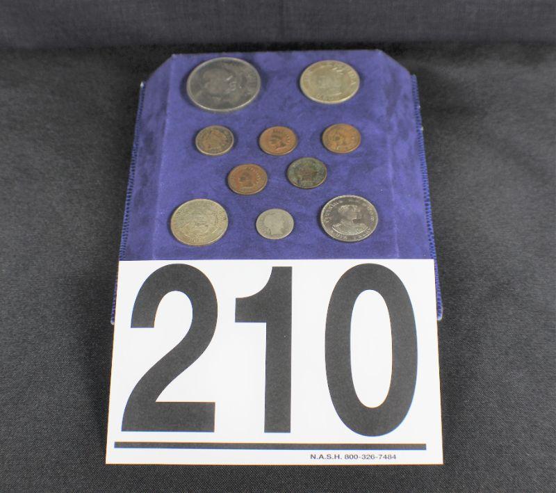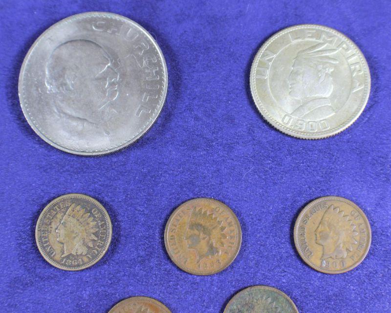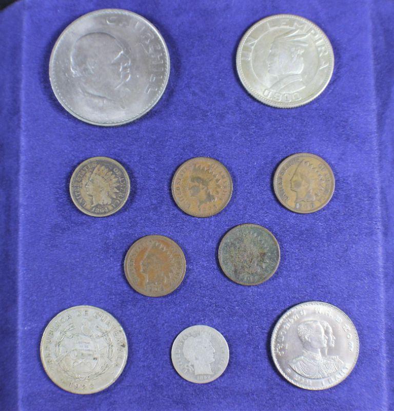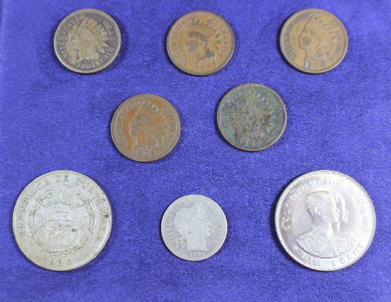 Includes: 1898 Barber Dime, 1965 Churchhill Commemorative, 1966 Bankok Olympic, Indian Head Cents & foreign coins. Independently verified as authentic.