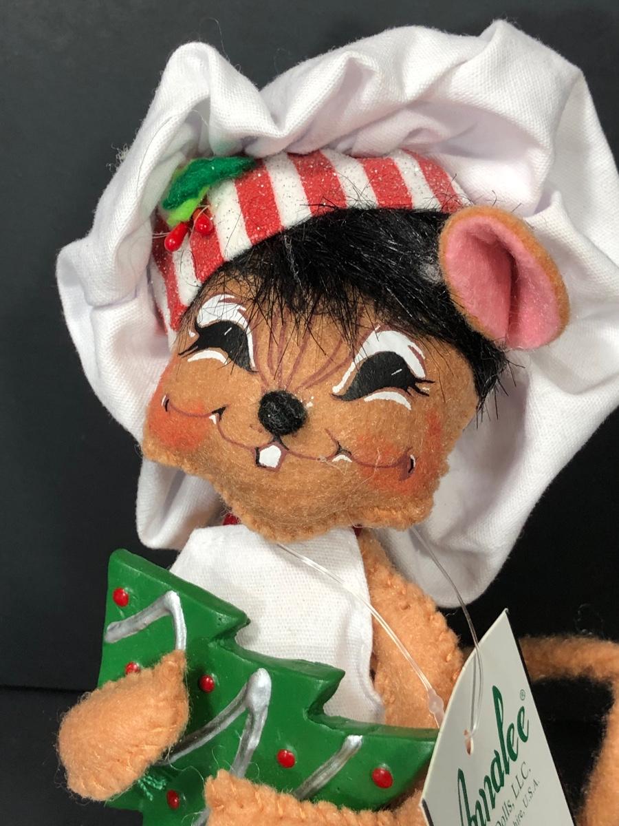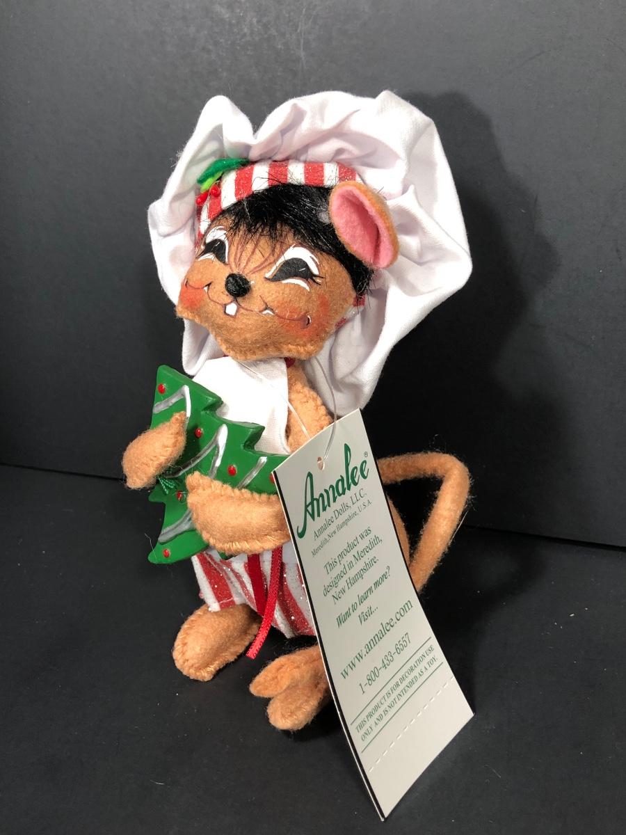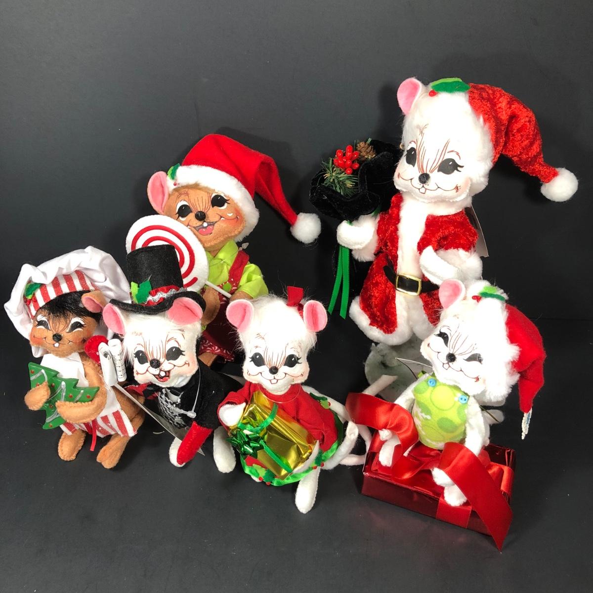 An assortment of Annalee dolls including 6" Shimmermint Chef Mouse, 8" Peppermint Mouse, 6" Snowflake Mouse on Gift Box, 8" Cozy Santa Mouse and more without tags.