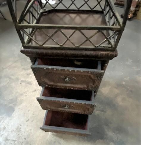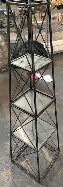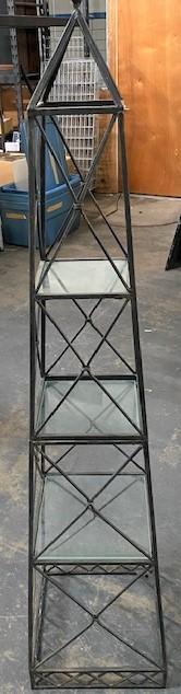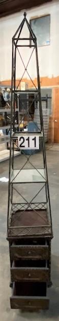 3 pieces. One piece of glass is missing. Base has three drawers. Measurement: 82"H x 14 1/2"W (base) 6"W (top)