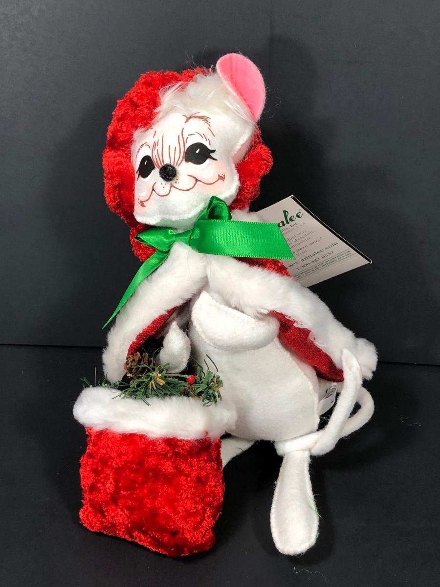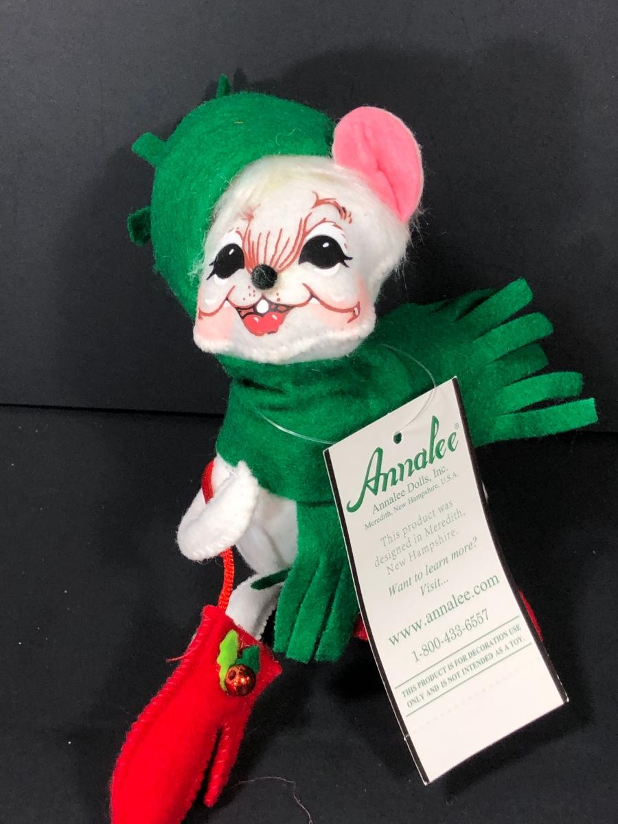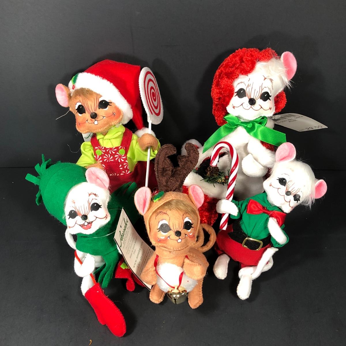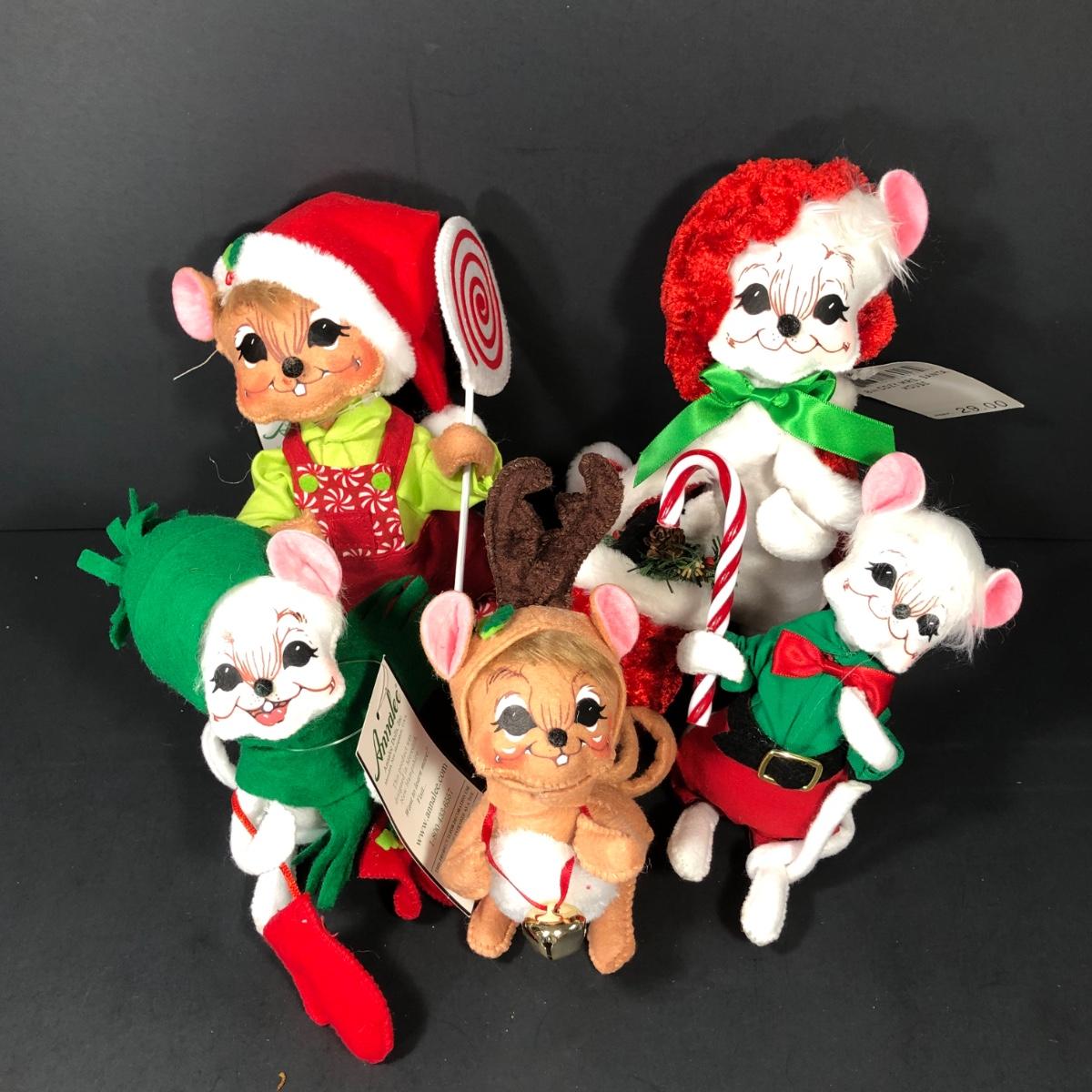Five Annalee dolls including 8" Peppermint Mouse, 8" Cozy Mrs. Santa Mouse, 6" Mouse with Mittens and more without tags.