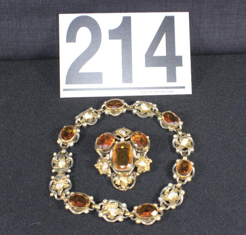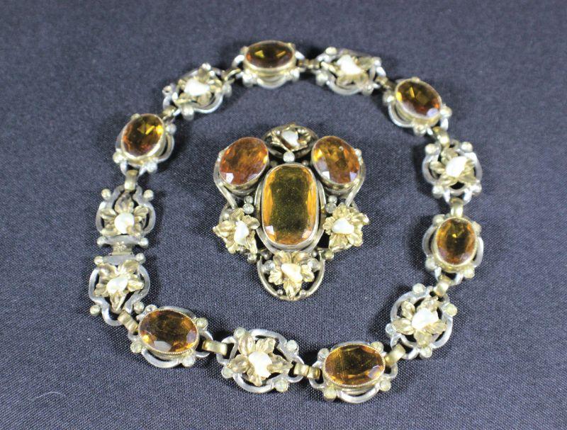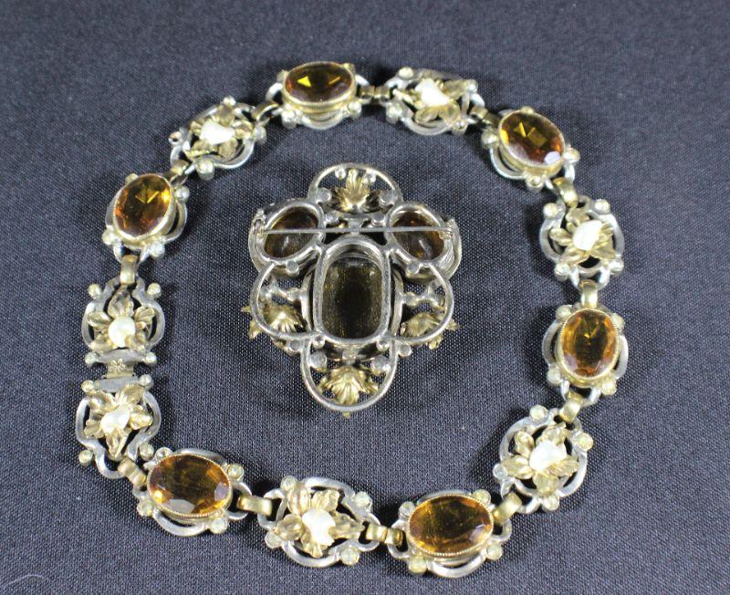 Believed to be plated or filled. Alternating rhinestones, citrine colored stones & mother of pearl. Pin & necklace.