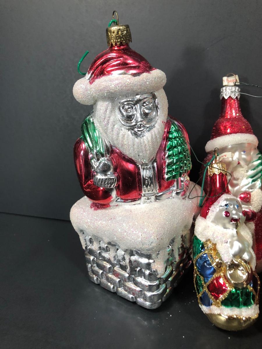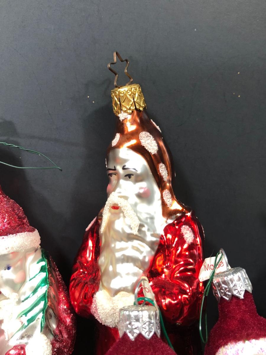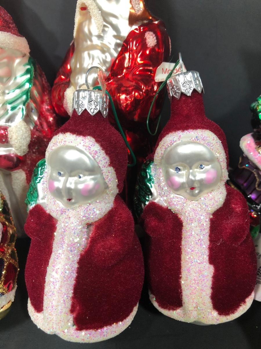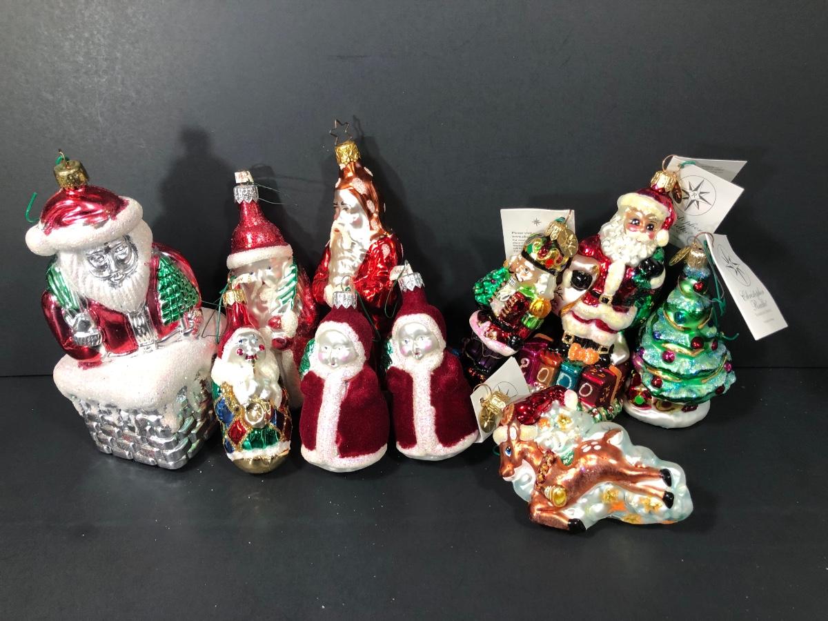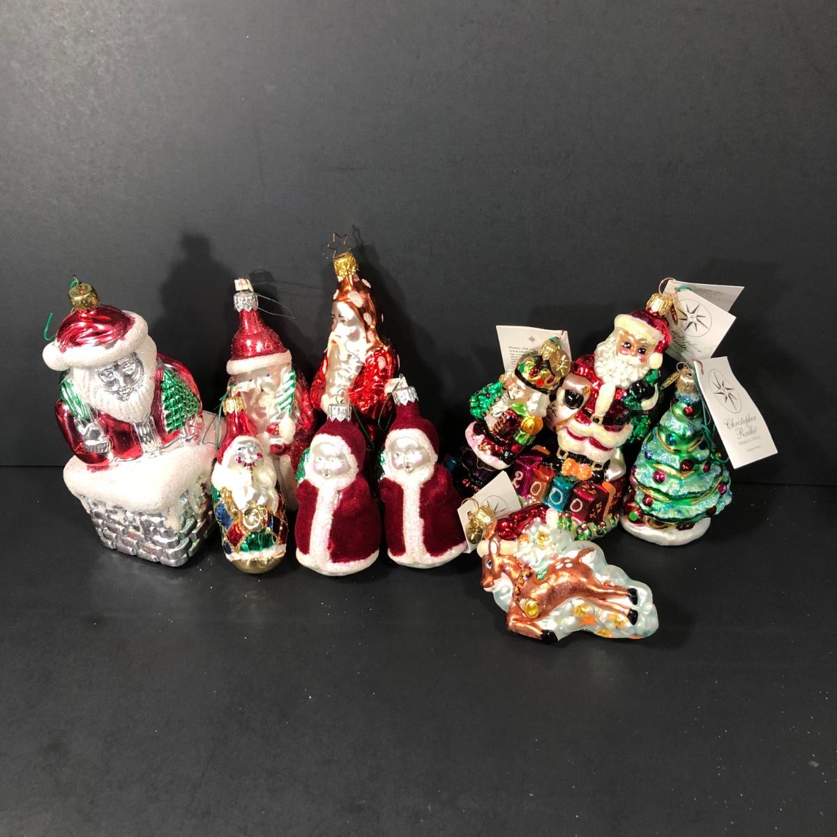 Christopher Radko ornaments include Christmas Cracker, Present-ing Santa 2000, Sparkling Spruce, and Dash-Her. Other ornaments are assorted and depict Santa.