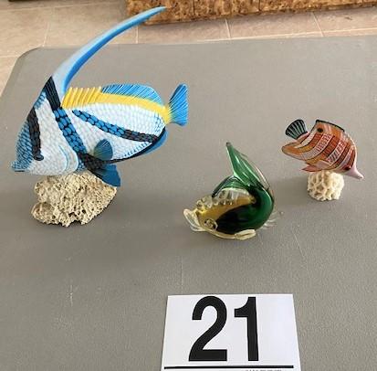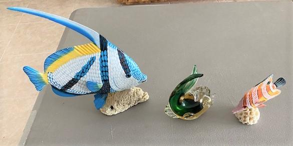 2 fish on coral bases & one glass paperweight with undiscernible label. Measurement: 9"W x 10"H (largest)