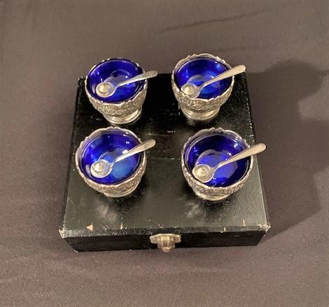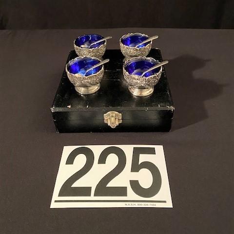 Original Case. Silverplated. With cobalt glass inserts. Estimated weight of lot: 5lbs. Measurement: 7"W x 7"H x 2"D