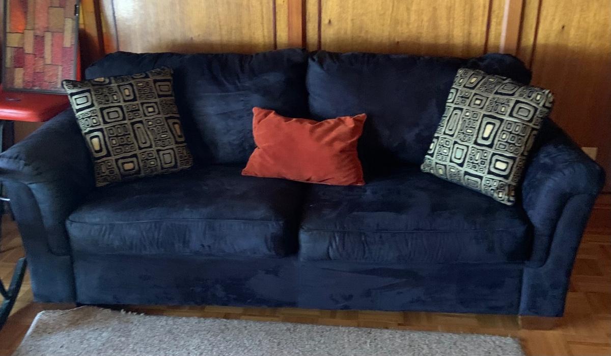 Lot:226G: Overstuffed Microfiber Couch with Throw Pillows.