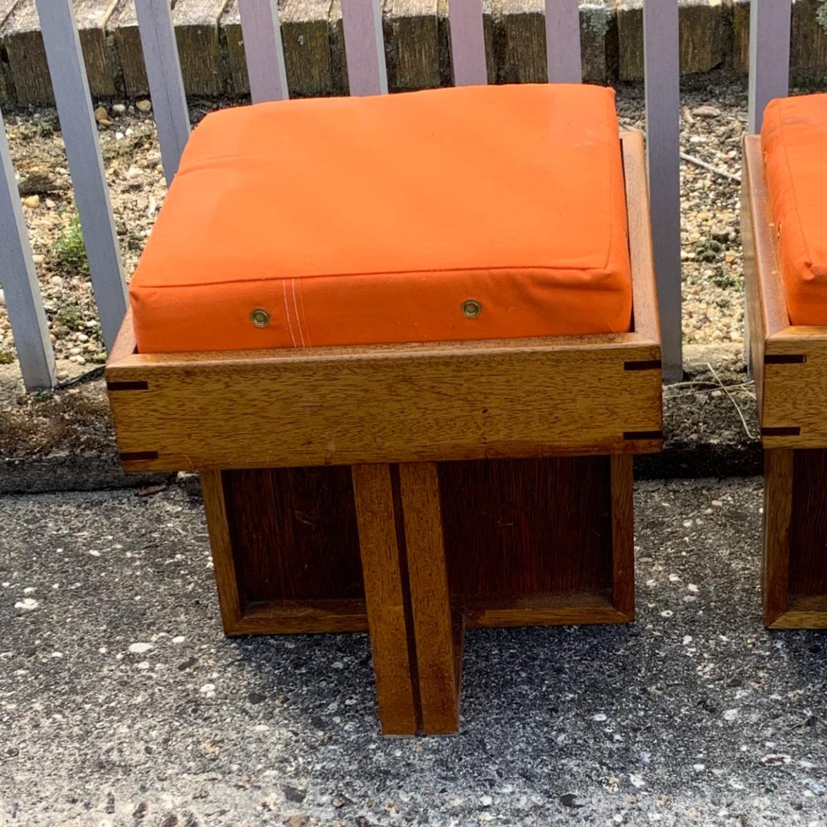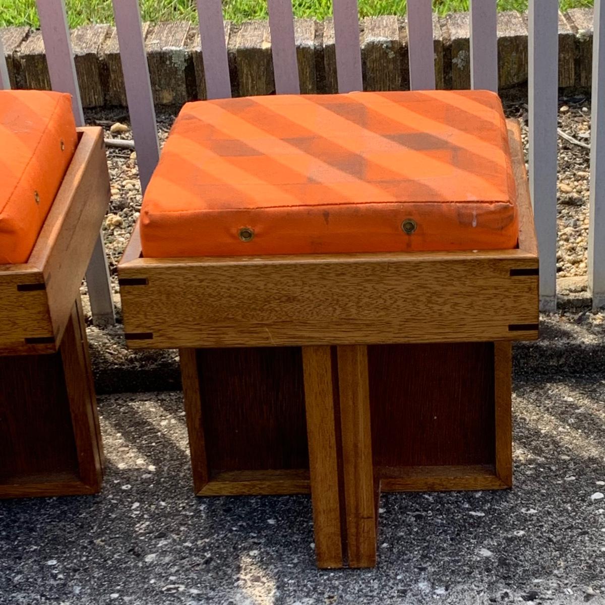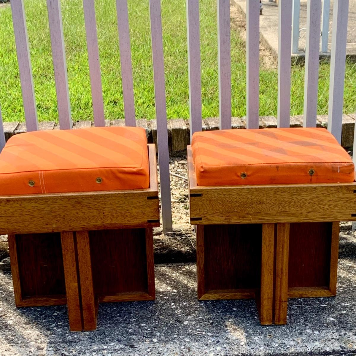 Lot:227G: Two Handcrafted Mid Century Ottomans/ Stool with Orange Canvas Cushions