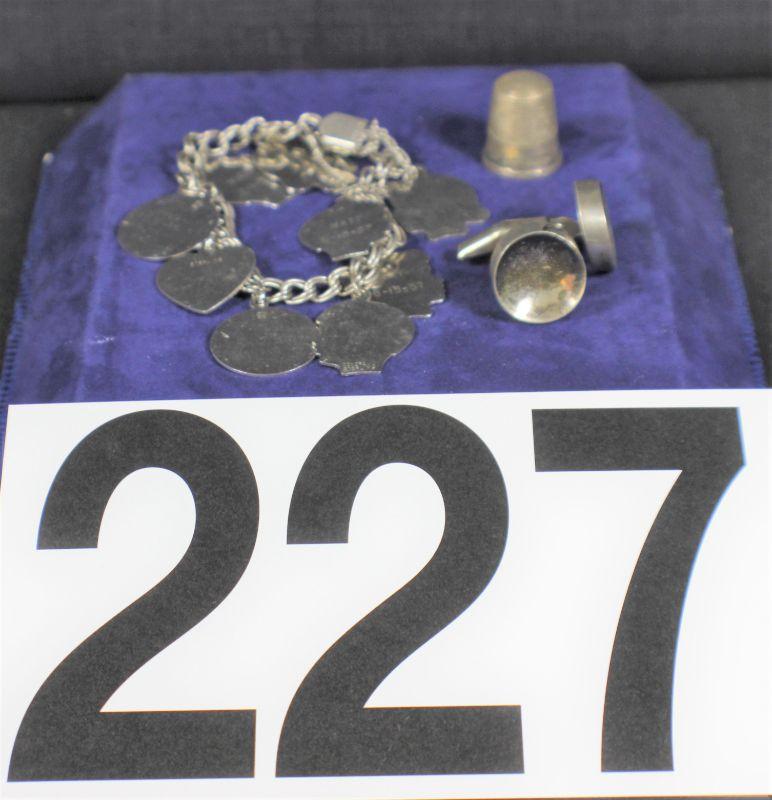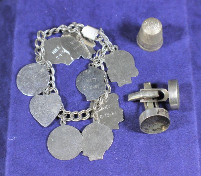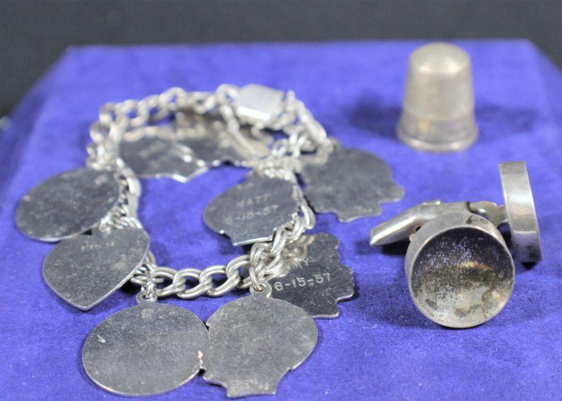 Includes: charm bracelet, thimble & pair of cuff links. 47g