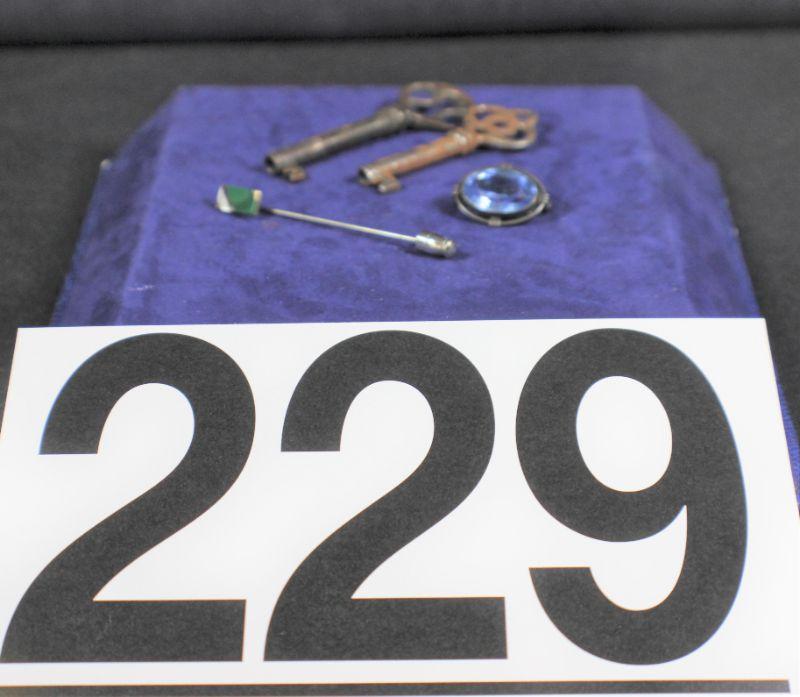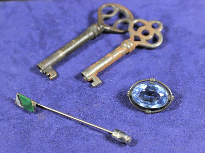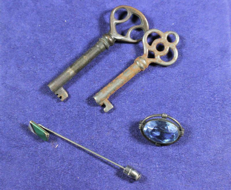 Including: stick pin, 2 skeleton keys, marked Sterling pin with blue stone.