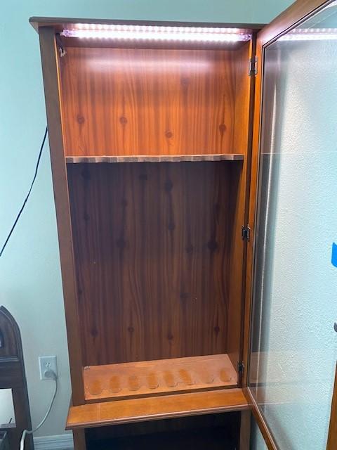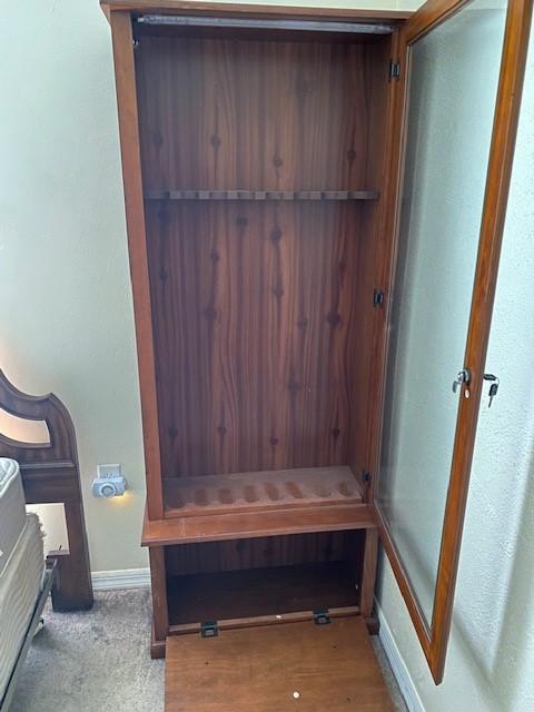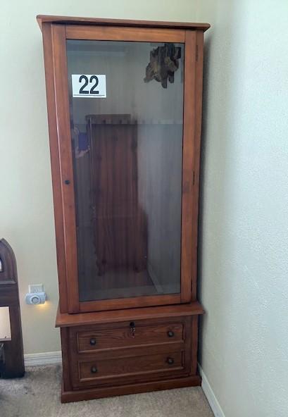 Pine wood construction. Has lower storage compartment. Light is working at time of cataloging. Includes key. Holds eight long guns. Measurement: 70 1/2"H x 28"W x 13"D