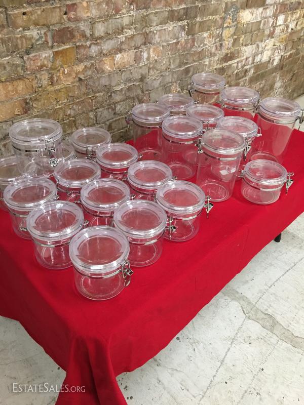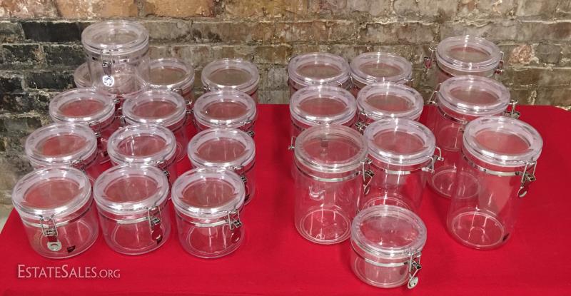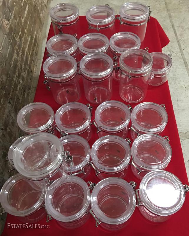 23 jars with lids that seal, rubber gasket. All in very good condition. They appear to have not been used. 5", 7" and 9" tall.