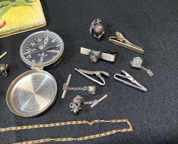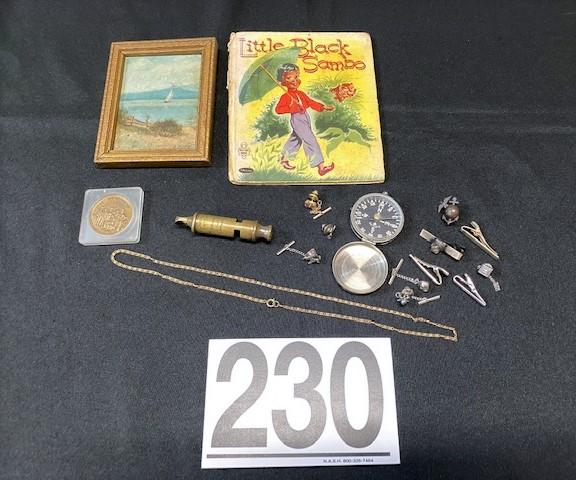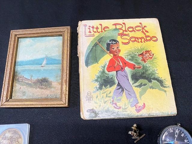 Includes: 1953 Little Black Sambo book, vintage German Compass, J. Hudson & co British whistle, signed oil on board & more.