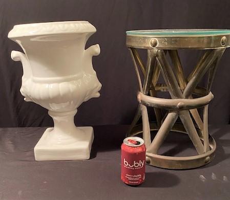 Brass pedestal and ceramic urn. Estimated weight of lot: lbs. Measurement: 17"H x 11"W (largest)