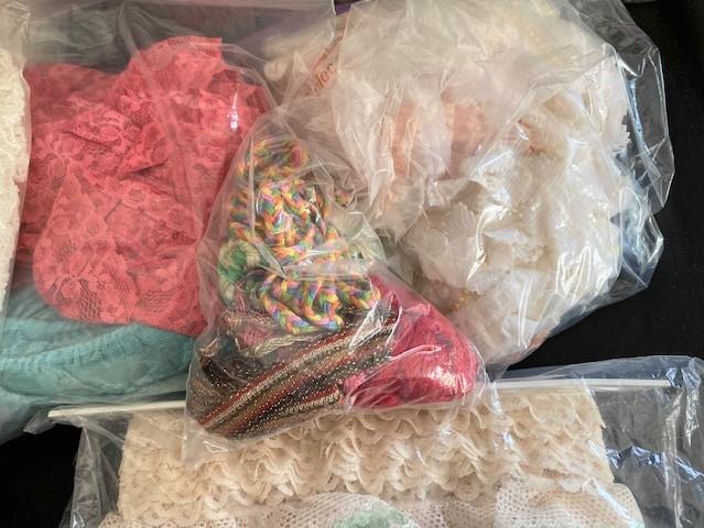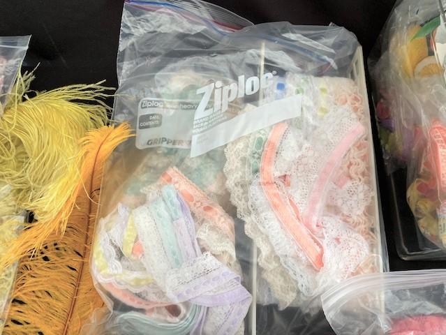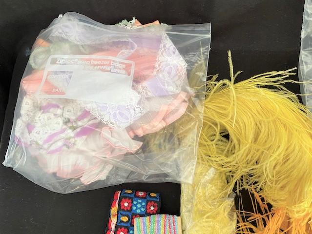 Feathers, lace, clothes & more. Estimated weight of lot: 10lbs. Measurement: 16" x 11" x 13"