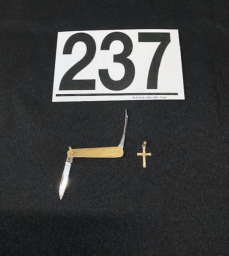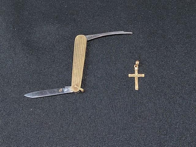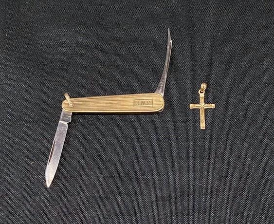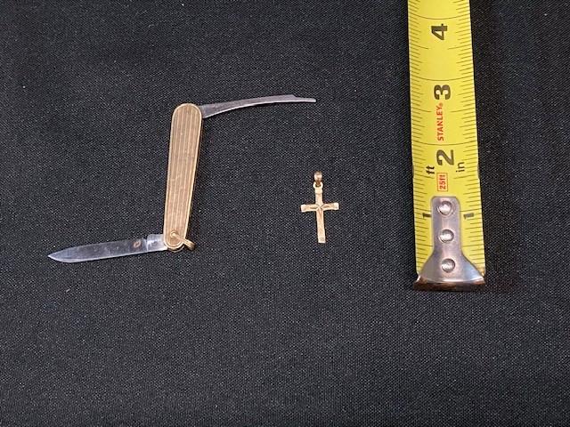 Includes: a cross and small pocket knife. Both items tested with Niton XRF metals analyzer. Blades on knife are stainless and not gold.