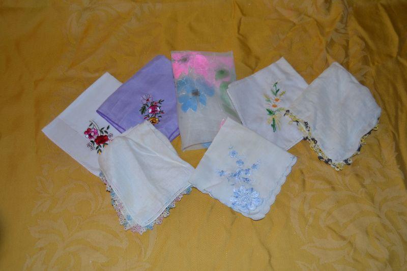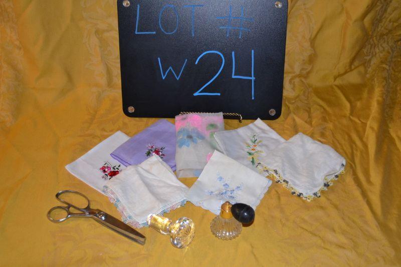 7 hand sewn Handkerchiefs, a Perfume Bottle, Metal Craft Scissors, Glass Wine Topper. We are shearing our prices in half, lend us a Hanky.