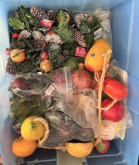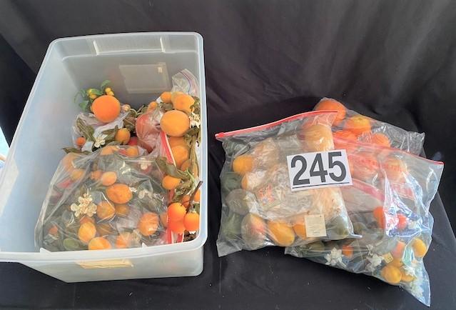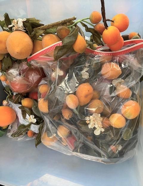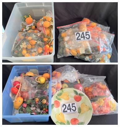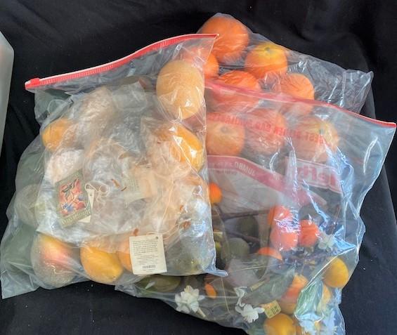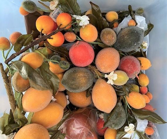 Faux fruit, flowers & more. 3 boxes. Estimated weight of lot: 15lbs. Measurement: 23" x 12" (per box)