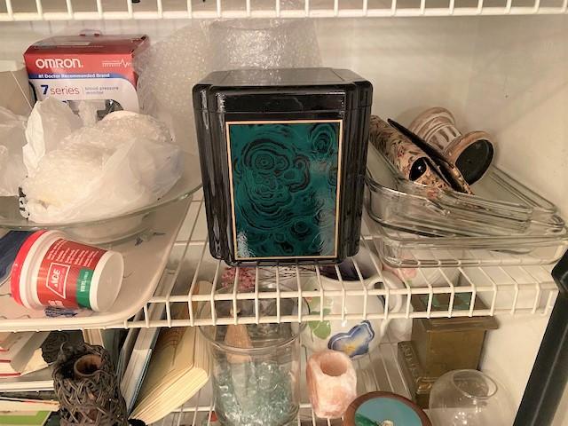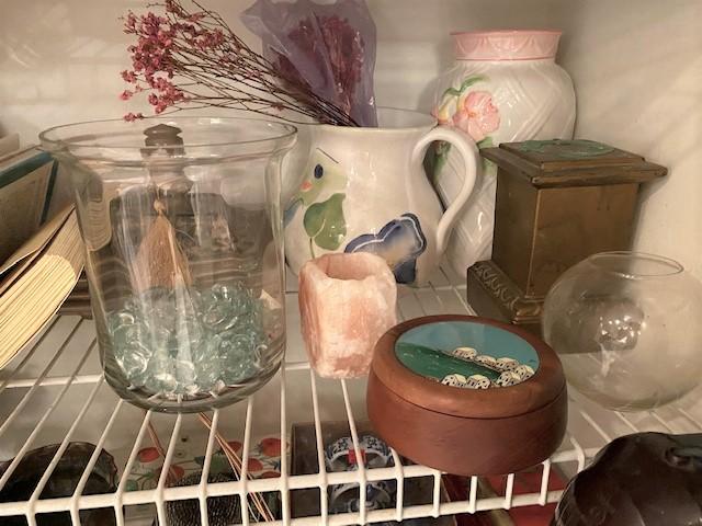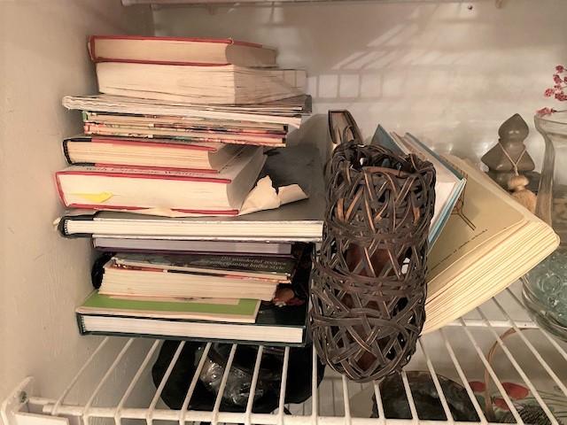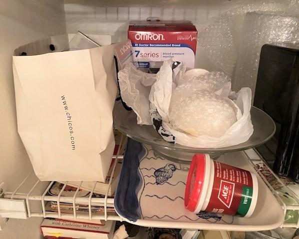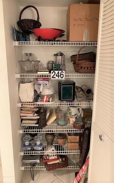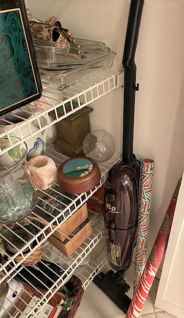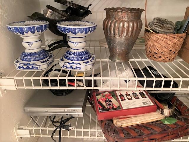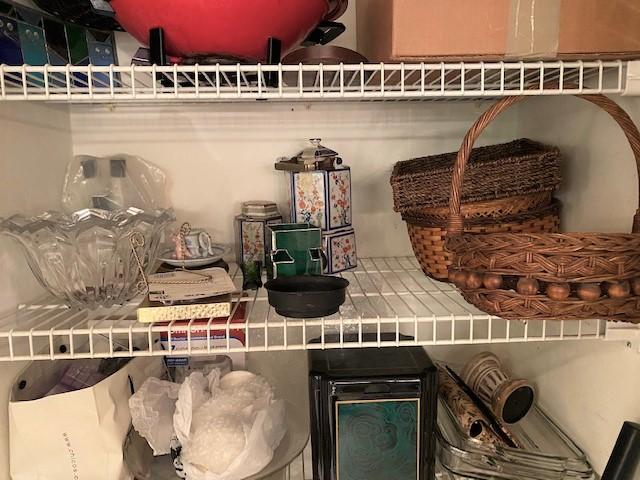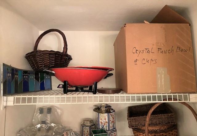 Contents of pantry. Includes: wok, crystal punch bowl, baskets, Delft, DVD player, blood pressure cuff, cookbooks, Pyrex baking dishes, Eureka floor sweeper & more.