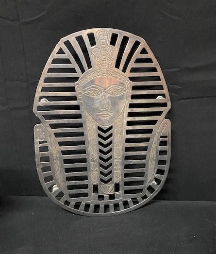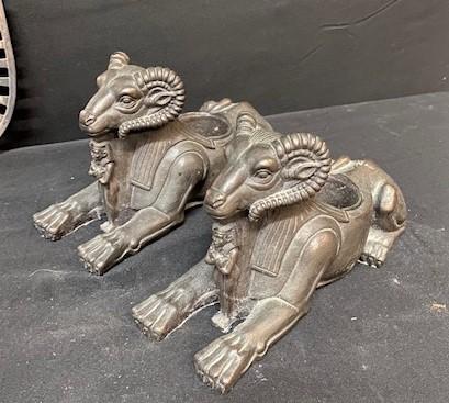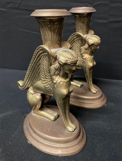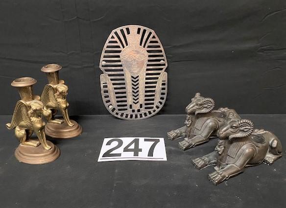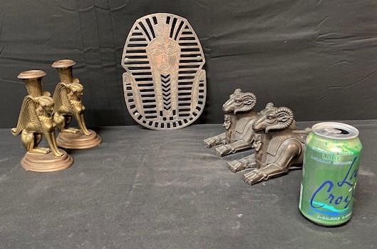 two griffin candleholder, two ram votive holders, death mask trivet. Measurement: 7"H ( griffin; each) x 10"L (trivet)
