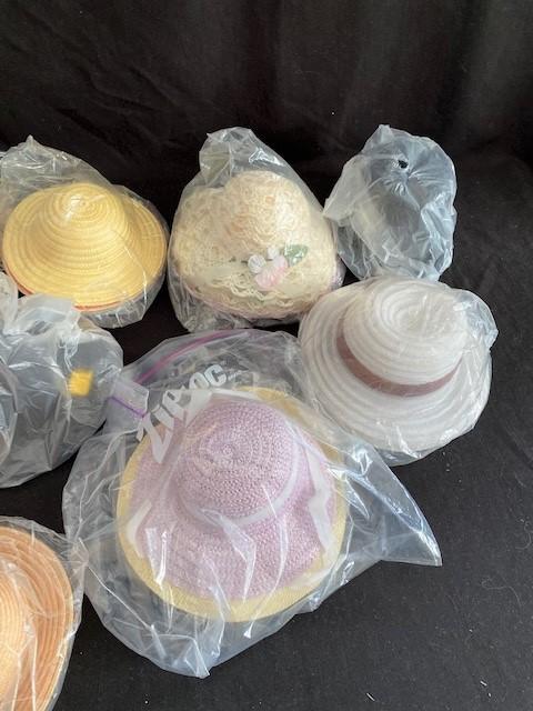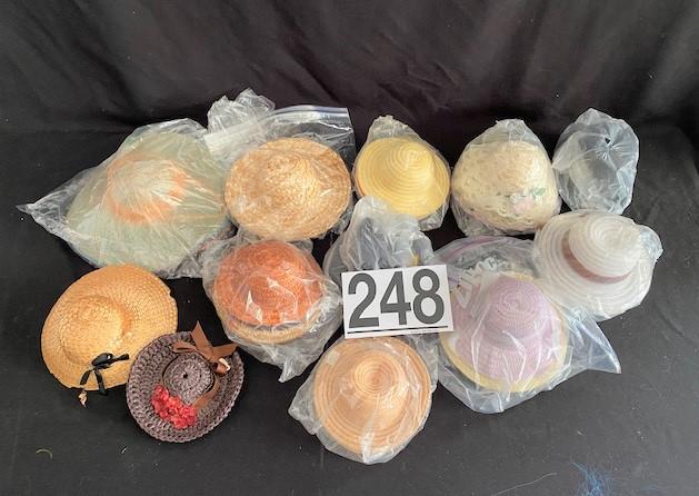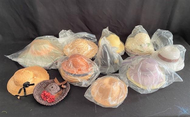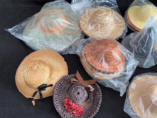 Mostly NOS. Straw & lace hats. 20+ hats. Estimated weight of lot: 5lbs. Measurement: 21" x 10"